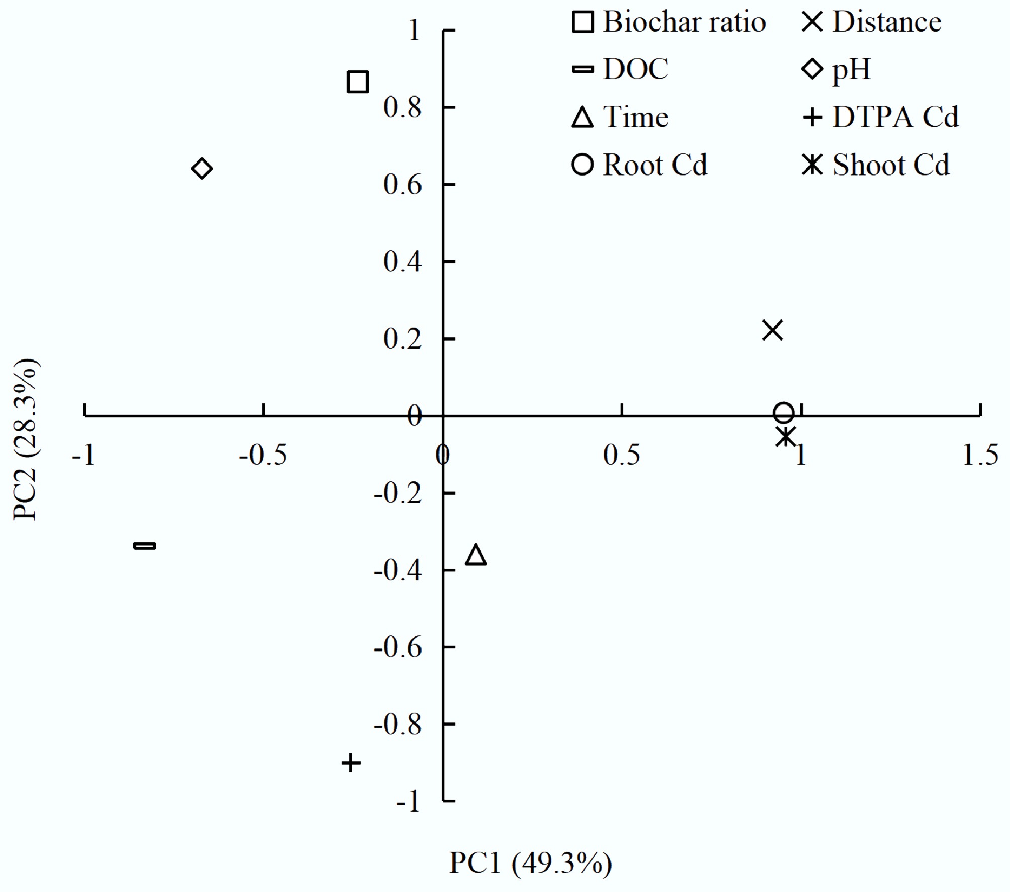 Principal component analysis (PCA) of charosphere drivers: ordination of biochar rate, distance, time, pH, DOC, DTPA-Cd, and wheat Cd concentrations in roots and shoots.
