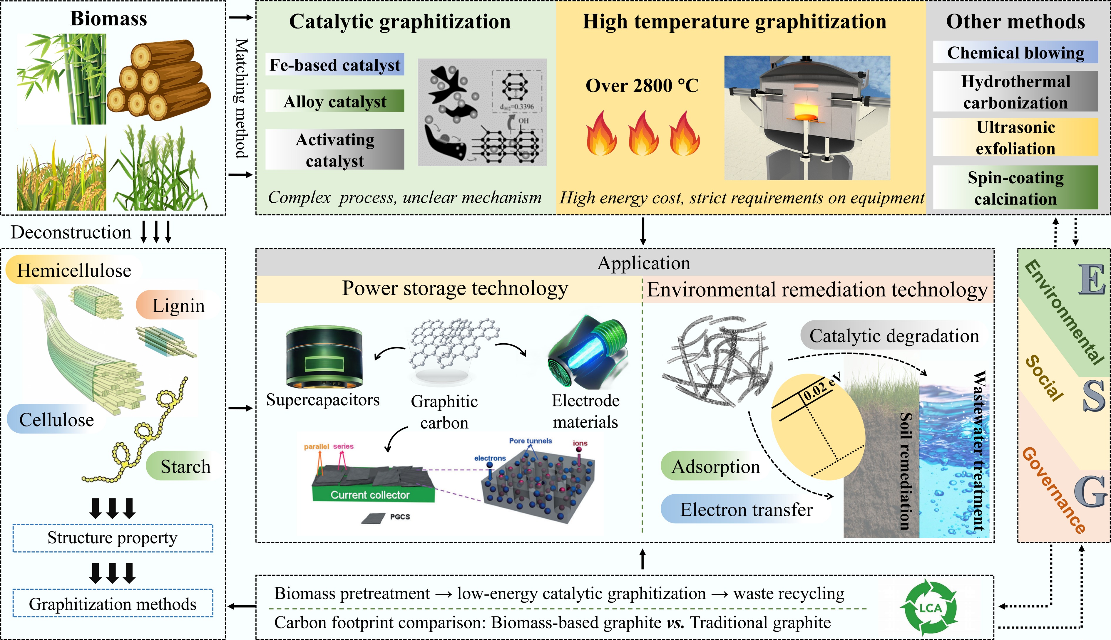 Abstract: The demand for graphitic carbon materials is growing steadily, yet traditional production methods heavily rely on fossil fuels or mineral graphite, failing to achieve sustainable development goals. Biomass, as a renewable, low-cost, and environmentally friendly carbon precursor, represents a highly promising alternative for graphitic carbon production. This review explores the graphitization potential of biomass components: cellulose enhances product orderliness, hemicellulose optimizes the microstructure of graphitic carbon, and lignin facilitates the formation of high-quality graphitic structures. Starch-derived carbon mainly forms microporous carbon, and a high branched-chain starch content is required for electrochemical applications. Additionally, the various metallic and non-metallic elements present in biomass exert differing effects on the graphitization process. This review also summarizes methods for producing biomass-based graphitic carbon (BBGC). Catalyzed graphitization can overcome the high-energy-consumption bottleneck of traditional processes, while high-temperature graphitization can leverage the aromatic structure of lignin to produce highly crystalline products. Emerging techniques such as chemical foaming, hydrothermal carbonization, and ultrasonic exfoliation enable the preparation of graphitic carbon tailored for specific applications. This review also explores the application of graphitic carbon in energy storage and environmental remediation, where its sustainability and cost-effectiveness surpass those of traditional materials. Furthermore, this review identifies an environmentally optimized pathway through life cycle assessment (LCA). From an environmental, social, and governance (ESG) perspective, BBGC, as carbon negative technology, can reduce greenhouse gas emissions while avoiding the ecological damage and social issues associated with mineral graphite mining, aligning with the United Nations Sustainable Development Goals (SDGs).