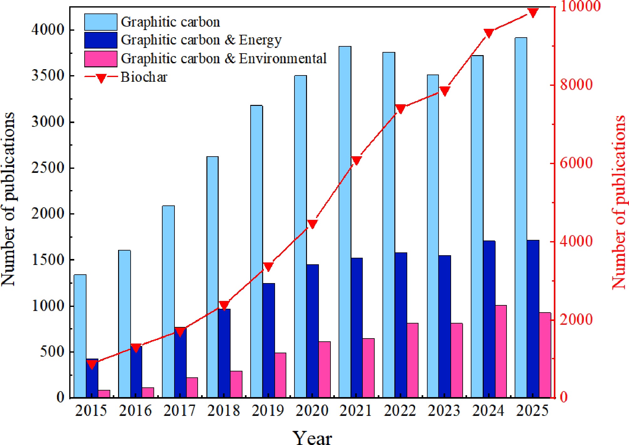 The publication status of articles related to the application of graphitic carbon in the energy and environmental fields from 2015 to 2025, as of March 02, 2026 (from the Web of Science).