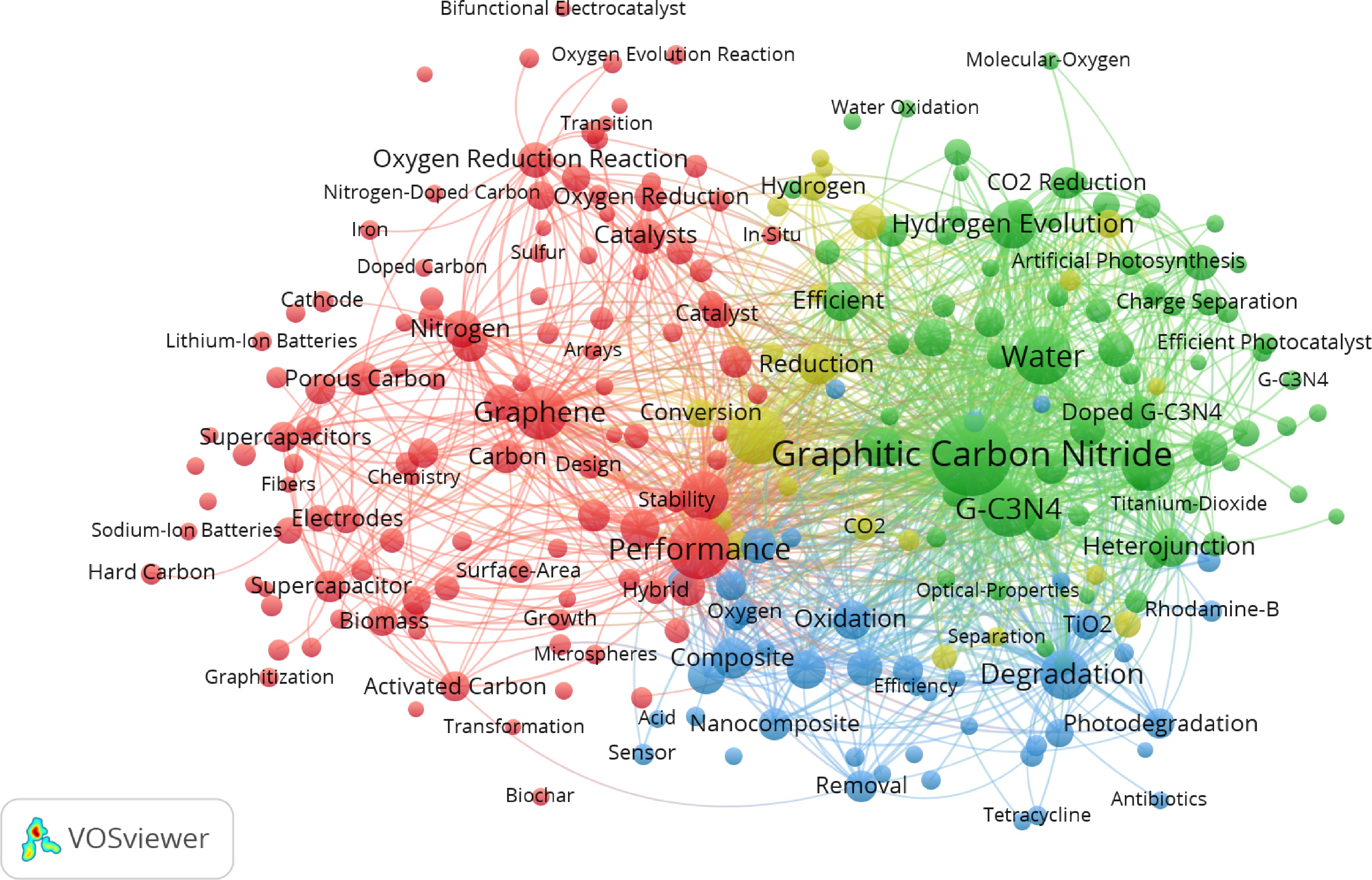 This review conducted a literature analysis of research related to BBGC, aiming to provide reliable recommendations for future studies. Research data on BBGC were retrieved from the Web of Science Core Collection database (as of November 25, 2025). Search terms included 'Graphitic carbon' or 'Graphitic carbon & Energy' or 'Graphitic carbon & Environmental', with the time range set from 2015 to 2025. After primary screening and duplicate removal, 6,000 papers were selected for bibliometric analysis based on relevance (highest to lowest). Visualization was performed using VOSviewer and bibliometric software, ultimately identifying 251 keywords (minimum occurrence threshold: 40 times). The visualization results are shown in Fig. 3. Keyword analysis indicates that over the past decade, graphitic carbon nitride has served as the primary carrier in BBGC-related research, while graphene is commonly employed as a modifying component to construct composite structures with graphitic carbon nitride. In Fig. 2, it is evident that this material finds extensive applications in both photocatalysis and energy storage fields, such as supercapacitors. Such composite systems can be utilized for clean energy production, like photocatalytic hydrogen generation, environmental remediation scenarios, including the degradation of pollutants such as Rhodamine B and tetracycline, as well as CO2 conversion, and simultaneously extend into energy storage domains like supercapacitors. Structural designs incorporating nanosheets and active sites enhance charge separation efficiency and energy storage performance. Research on preparation techniques like in-situ synthesis and heterostructure construction also balances catalytic activity, stability, and energy storage performance. This research focus is no coincidence. It responds to demands for renewable energy development, environmental remediation, and energy storage technology upgrades. Through composite modifications, it overcomes the limitations of single materials, thereby advancing BBGC applications across energy, environmental, and energy storage sectors.