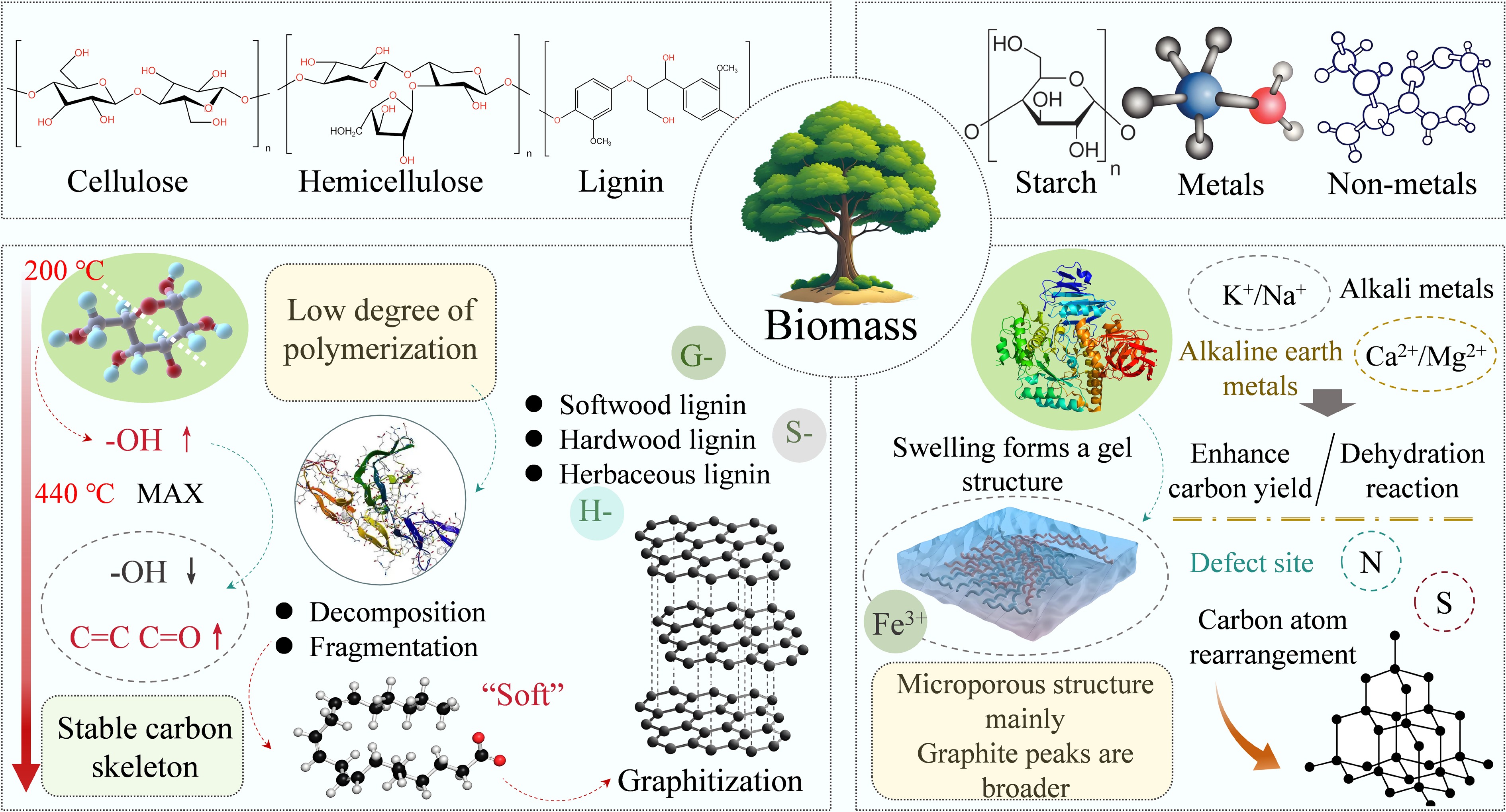 In addition to the three main biopolymers, biomass also contains AAEMs such as potassium (K), sodium (Na), calcium (Ca), and magnesium (Mg). These elements, although found in relatively small quantities, have a significant effect on the further graphitization process of biomass[72].