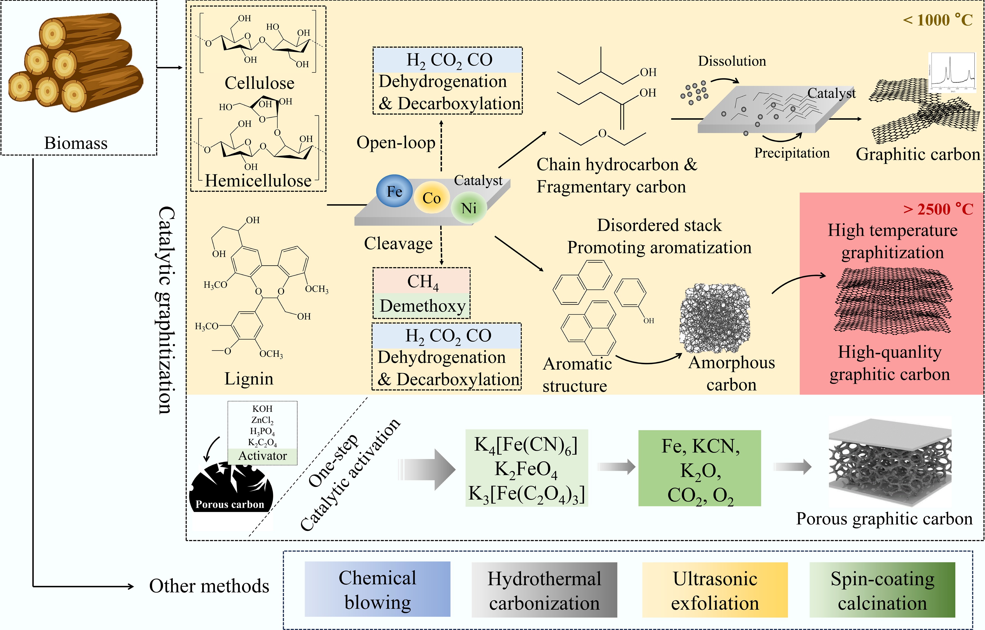 Catalytic graphitization of cellulose. Cellulose, as a key component of biomass, possesses the inherent potential to be converted into high-quality graphitic carbon due to its high crystallinity and well-ordered glucose unit framework. Catalysts such as iron can effectively trigger the graphitization process[119]. To further improve the graphitization degree of cellulose and enhance the performance of cellulose-based graphitic carbon, pretreatment techniques and catalysts play an important role.