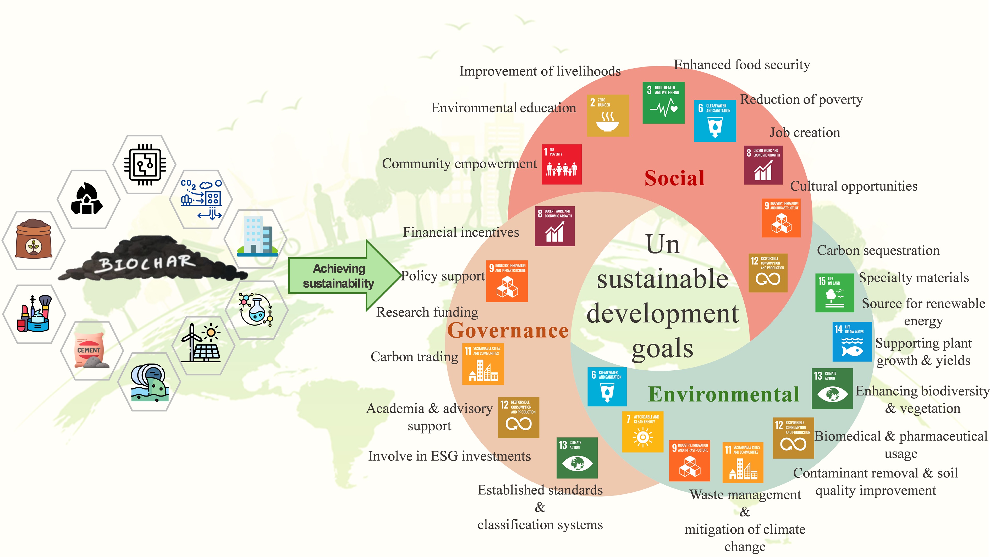 With the increasing focus on environmental, social, and economic challenges, many countries aim to achieve the UN SDGs through sustainable practices. In this regard, numerous industries have adopted eco-friendly initiatives. One notable approach involves the use of biomass-derived carbon materials. In 2018, the IPCC officially acknowledged biochar as a negative carbon emission technology, highlighting its capability to remove carbon dioxide from the atmosphere[300]. Biochar is a comprehensive term that connects various environmental management applications. This term extends beyond its role in agriculture and soil improvement, branching into diverse areas in which its properties can be coupled for environmental and ecological benefits[301].