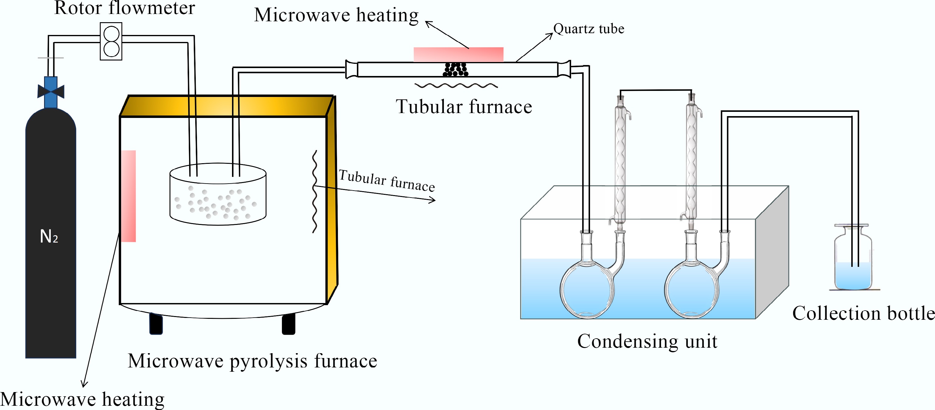 WPF was taken from discarded mulch waste in farmland in Shihezi City, Xinjiang, China, with an elemental ratio of C (28):H (4):O (1). Pyrolysis was carried out in a microwave-assisted pyrolysis reactor, and the resulting volatiles were catalytically reformed in a catalytic reactor system, as illustrated in Fig. 1. The system primarily consists of a gas supply unit, a dedicated quartz reactor, and thermocouples for temperature measurement. The catalytic reformer comprises an independent microwave heater, a condenser, and a liquid collection system. Specifically, 5 g (± 0.05 g) of WPF was placed in the quartz reaction vessel, while 2.5 g of catalyst was loaded into the catalytic reforming zone and secured with quartz wool. Under microwave irradiation, silicon carbide balls in the quartz reactor were heated to 500 °C, and the catalytic reformer was simultaneously heated to the target temperature. The microwave operated at a frequency of 2.45 GHz with a power of 800 W, which achieved a heating rate of 35 °C/min; identical parameters were applied in both the catalytic and pyrolysis zones. High-purity nitrogen was introduced into the system at a flow rate of 50 mL/min to maintain an inert atmosphere. The resulting liquid pyrolysis oil was cooled, collected, and weighed. A small amount of coking coal was observed in the pyrolysis reactor, and the yield of non-condensable gases was determined based on the mass difference between the feedstock and the coking coal.