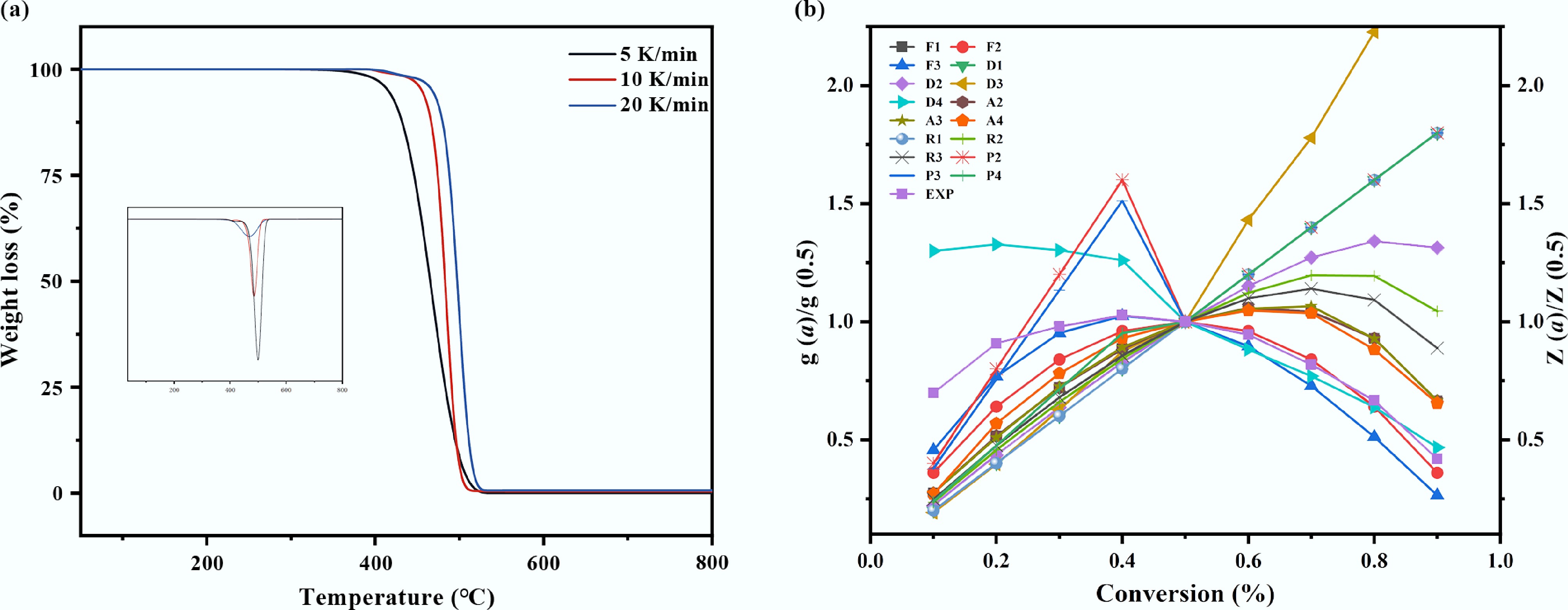$ \dfrac{\text{z}(\alpha)}{\text{z}(0.5)}=\left[\dfrac{\rm{f(\mathit{\alpha})g(\mathit{\alpha})}}{\mathrm{f}(0.5)\mathrm{g}(0.5)}\right]=\left(\dfrac{\text{T}_{\alpha}}{\text{T}_{\text{0.5}}}\right)^{\text{2}}\dfrac{\text{(}\rm{d\alpha/dt)}_{\alpha}}{\rm{(d\alpha/dt)}_{0.5}} $ (4) where, T0.5 and (dα/dt)0.5 represent the temperature and conversion rate at α = 0.5, respectively. The left side of the equation, f(α)g(α)/f(0.5)g(0.5), corresponds to the theoretical curves of various reaction models listed in the table above, while the right side represents the reduced rate curve derived from experimental data using Eq. (4). By comparing the theoretical master plots with the experimental reduced rate curves, the most appropriate reaction mechanism can be determined[16,20].