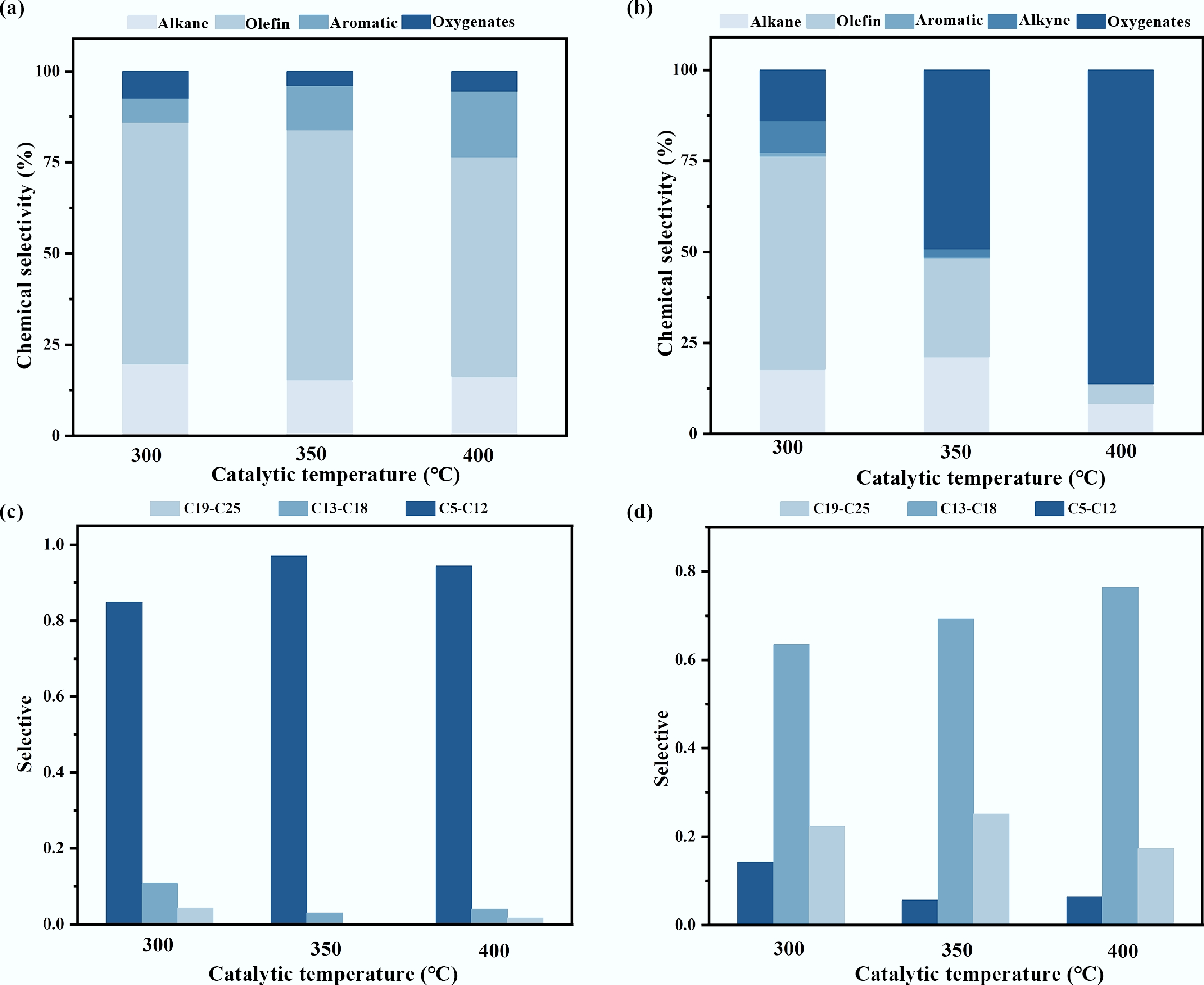 At the intermediate temperature of 350 °C, the catalytic pyrolysis exhibited optimal selectivity for olefin production. The pyrolysis oil attained the highest olefin content (69%) observed in this study, coupled with a distinct shift in the carbon number distribution toward lighter C5–C12 hydrocarbons (Fig. 3a). This product distribution is characteristic of a carbocation-mediated reaction pathway facilitated by the catalyst's strong acid sites. These sites preferentially adsorb and protonate olefinic intermediates, generating carbocations that readily undergo selective β-scission, which is responsible for the high yield of light olefins[8]. A concurrent series of secondary reactions, including oligomerization, cyclization, and dehydrogenation of a portion of these olefins and dienes on the acid sites, led to an increase in the aromatic content to 15%. The composition of the deposited tar at this temperature was intermediate between that observed at 300 and 400 °C. The proportion of oxygenated compounds was moderate, and a noticeable reduction in C18–C24 heavy hydrocarbons was evident compared to the 300 °C condition (Fig. 3b). These observations regarding the intermediate nature of the deposits and the efficient cracking of heavy components were further corroborated by scanning electron microscopy analysis of the spent catalysts (Supplementary Fig. S4).