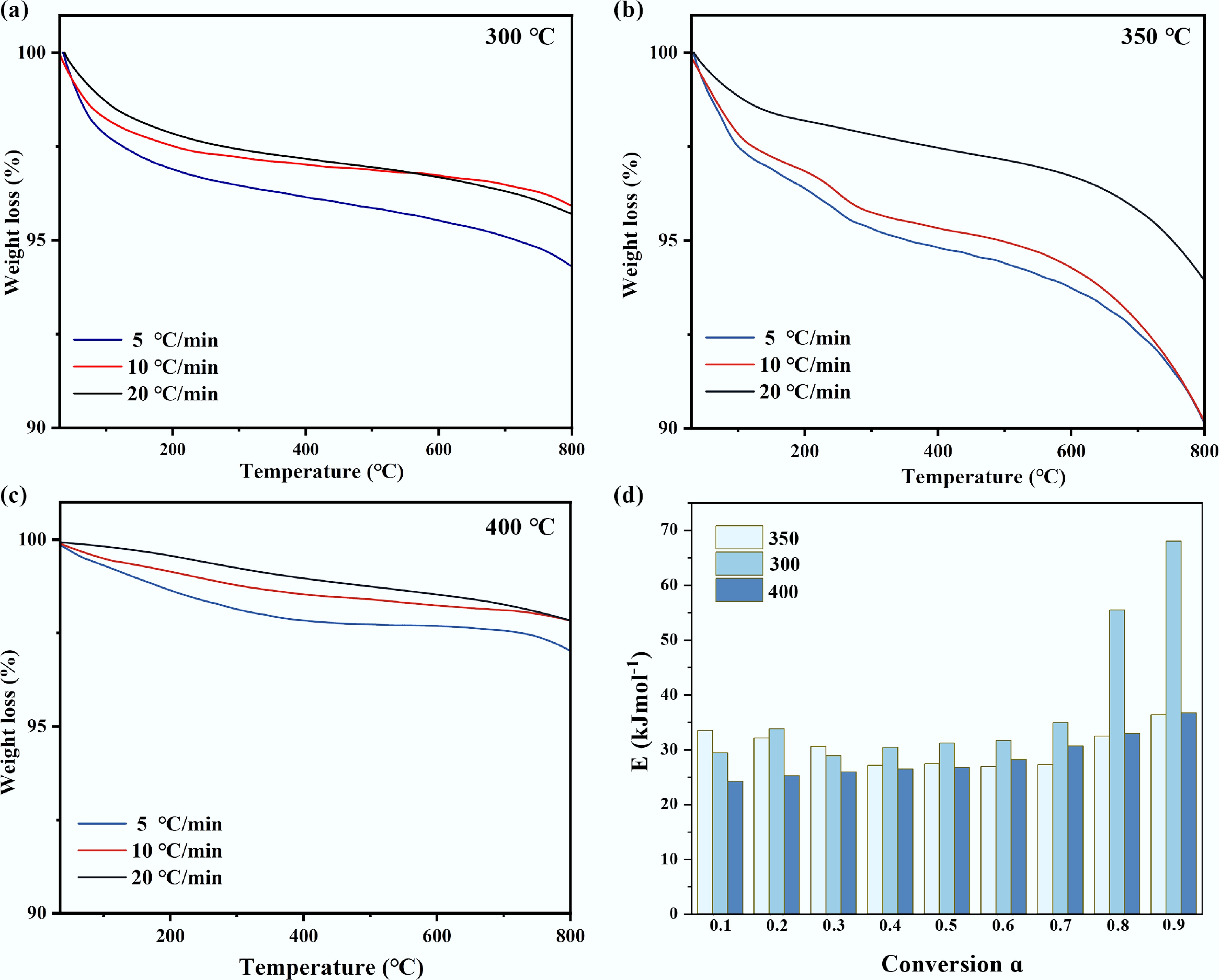TG of waste catalysts at different catalytic temperatures: (a) 300 °C, (b) 350 °C, (c) 400 °C, (d) activation energy distribution of tar obtained by the model-free method of pyrolysis kinetics.