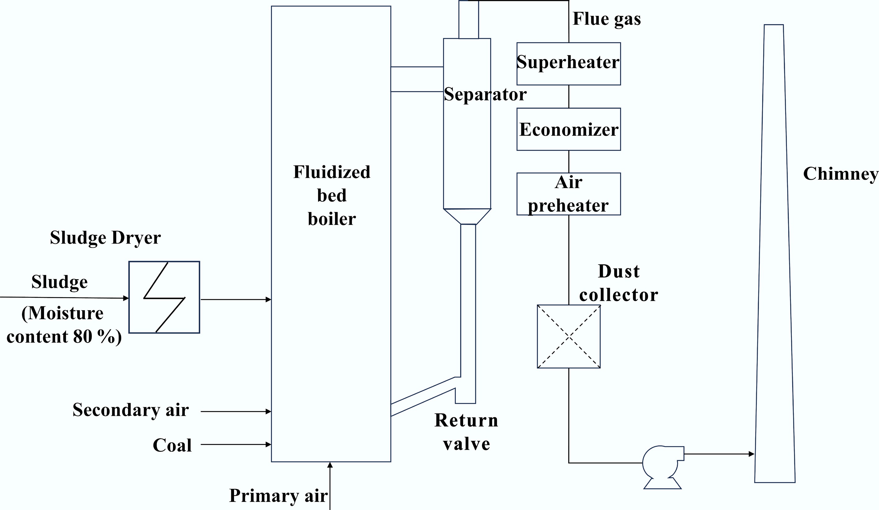 Sludge co-combustion technology achieves efficient resource recovery through unique combustion mechanisms and system design advantages: (1) The intense turbulent mixing within the furnace and extended gas residence time significantly enhance heat and mass transfer efficiency, ensuring complete sludge combustion. (2) Its wide fuel adaptability enables processing of sludge fuels with fluctuating moisture and ash content. (3) The typical low–to–medium combustion temperature range (850–950 °C) ensures complete combustion of organic matter while effectively suppressing the formation of gas-phase pollutants (such as thermal NOX) and preventing dioxin generation[13,14]. To more clearly illustrate the co-combustion process, Fig. 4 shows a typical sludge co-combustion system flow: First, the raw sludge is dewatered and pretreated in a dryer. Subsequently, the dried sludge is mixed with coal and enters the combustion chamber, where it generates high-temperature flue gas. Finally, the heat from the flue gas is used to generate electricity via the turbine, and the steam is then condensed and recycled. The system integrates processes of drying, incineration, and heat recovery, thereby significantly reducing the negative impact of high-moisture sludge on incineration efficiency.
