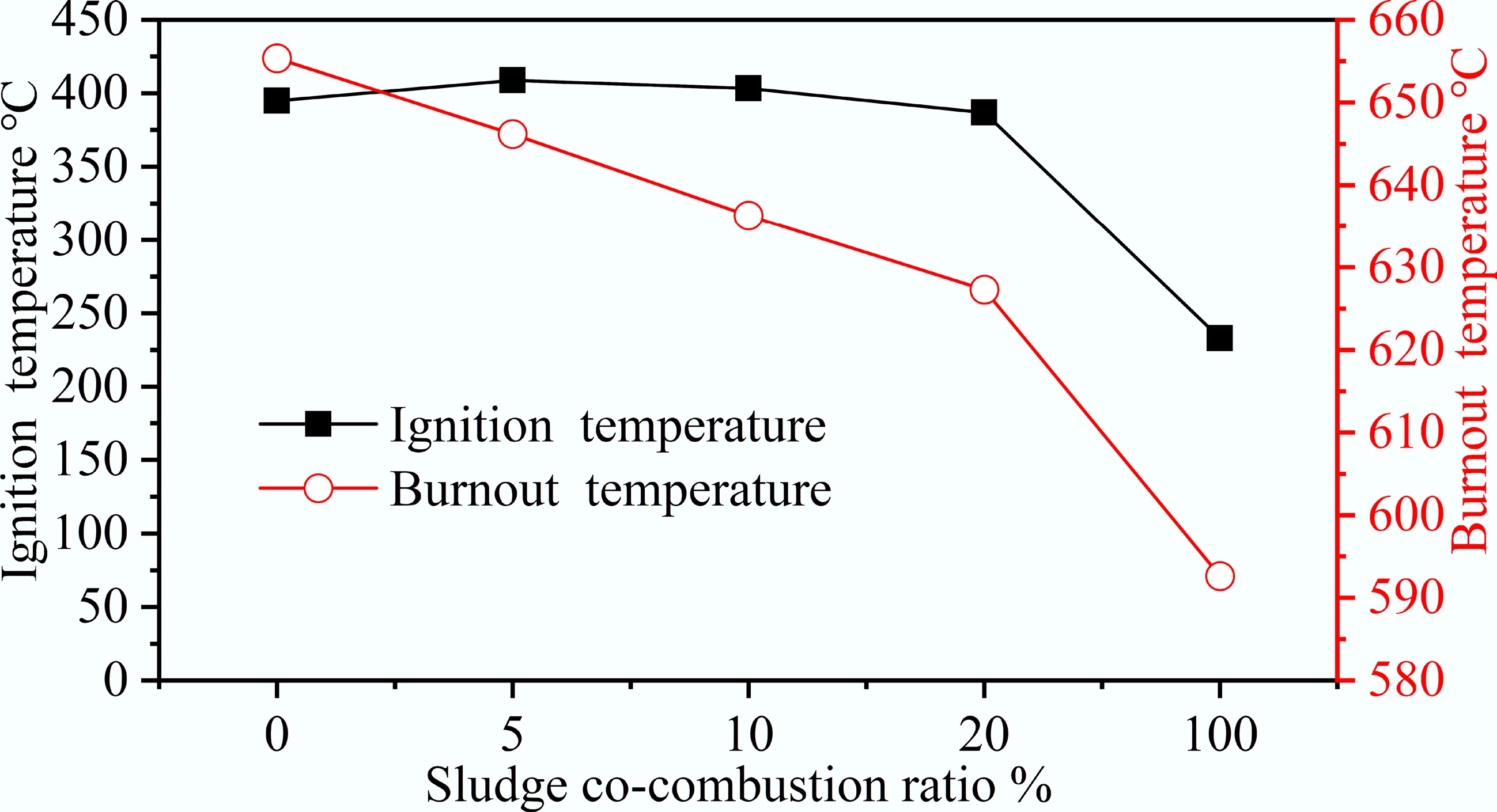 Ignition and burnout temperatures for sludge co-combustion. The figure was redrawn and redesigned based on data from Tong et al.[68].
