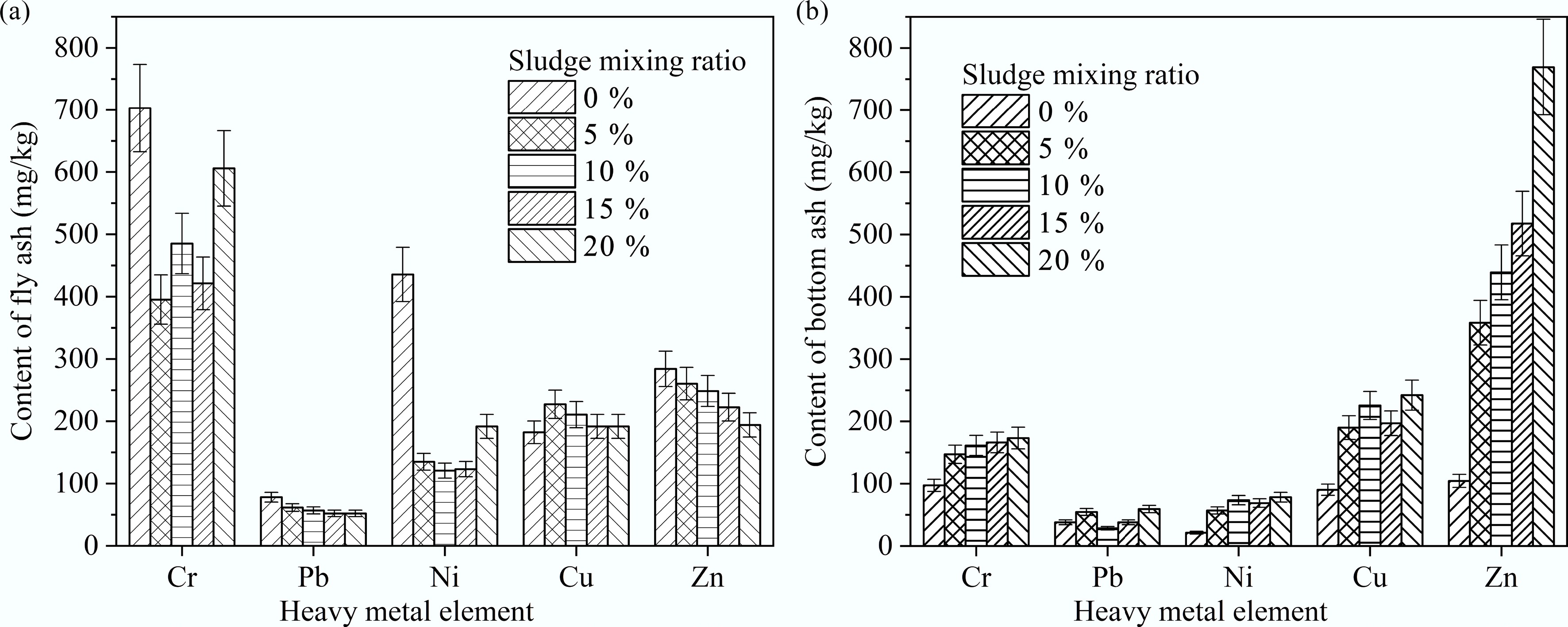 Effect of sludge co-combustion on heavy metal content in bottom slag and fly ash. (a) Fly ash. (b) Bottom ash[74].