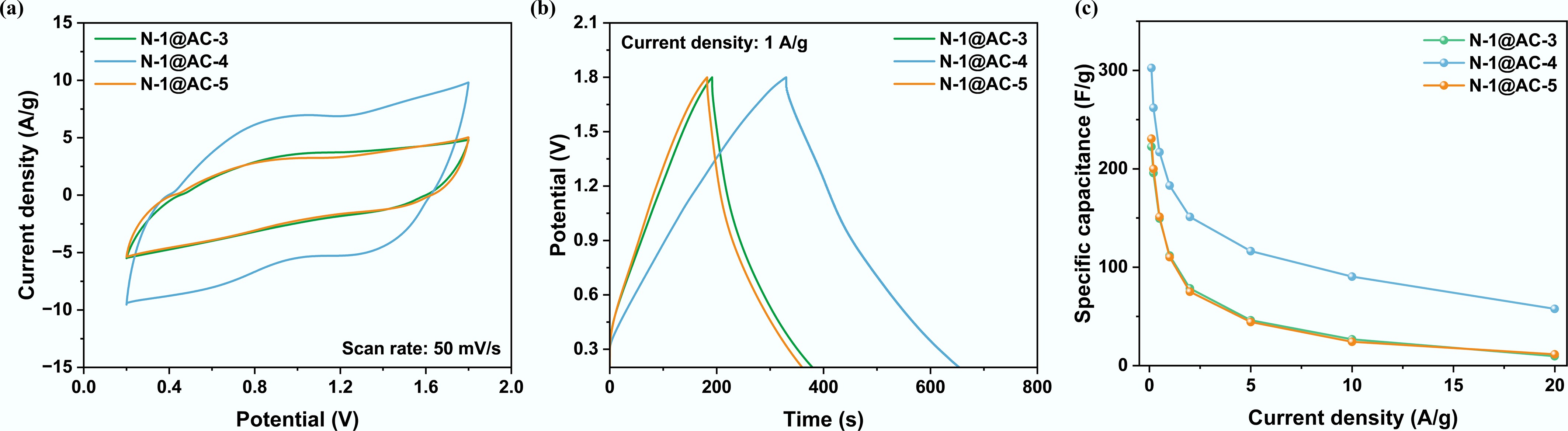The specific capacitance of N-1@AC-3, N-1@AC-4, and N-1@AC-5 was calculated to be 206.6, 249.3, and 211.3 F g−1, respectively (Fig. 1c). The rate capacitance (Fig. 1c) was evaluated at different current densities (0.1–20 A g−1). Specifically, the specific capacitance initially increased and subsequently decreased as the amount of KOH increased. This nonlinear performance stemmed from the dual effects of KOH activation. A moderate degree of activation (N-1@AC-4) etched the carbon skeleton to generate rich micropore-mesoporous structures (with a specific surface area of 1,270.9 m2 g−1), thereby providing more active sites for ion adsorption. However, excessive activation with KOH (N-1@AC-5) caused the collapse of pore walls and a reduction in mesoporous volume, consequently reducing the specific surface area and damaging the conductive network, which ultimately compromised the rate performance. Accordingly, an optimal carbon precursor to activator mass ratio of 1:4 contributed to the preparation of porous carbonaceous materials with superior electrochemical performance.