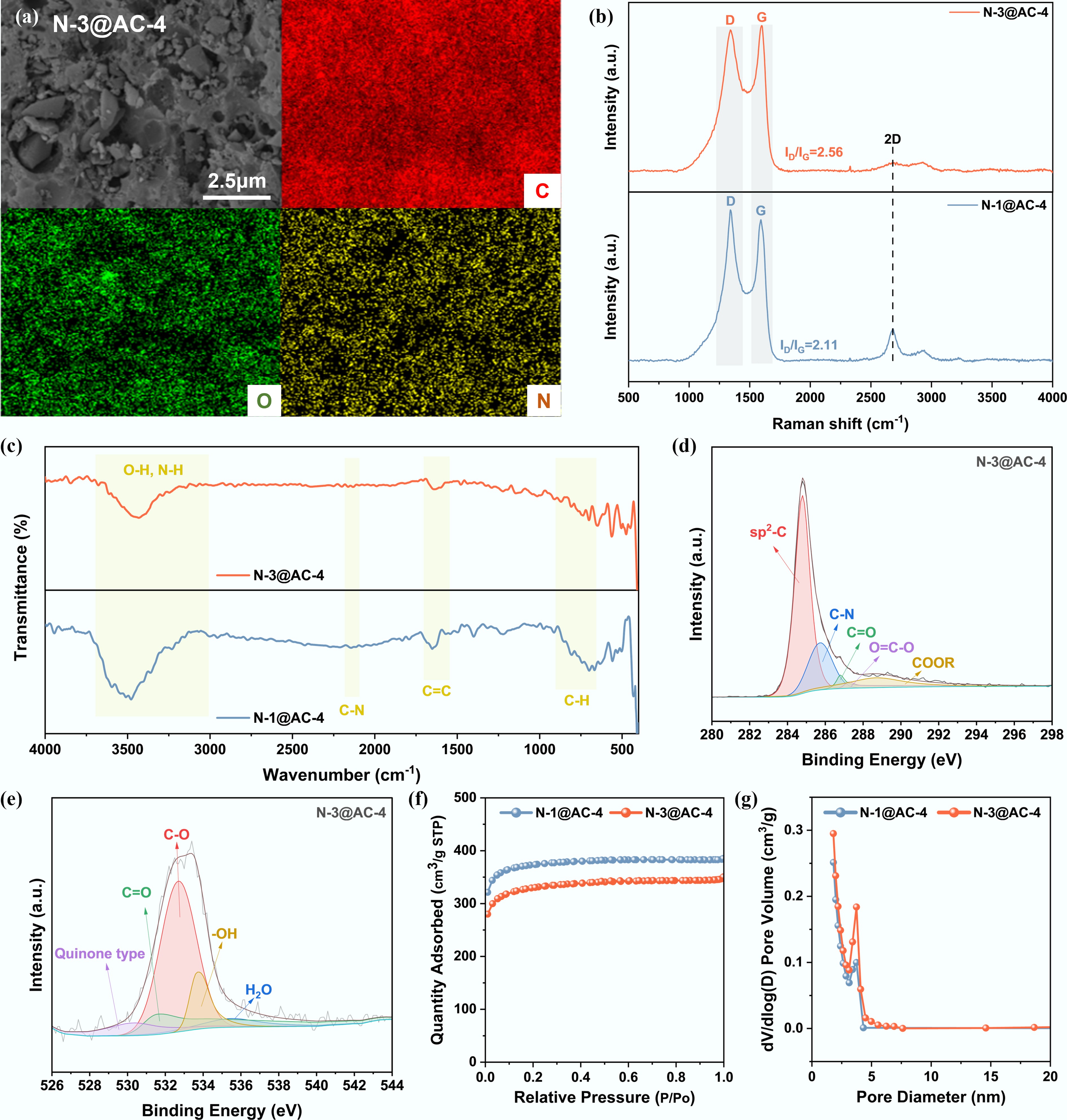 Physicochemical characteristics of NHPCs: (a) SEM images and EDS elemental maps of N-3@AC-4; (b) Raman spectra; (c) FTIR spectra; (d), (e) High-resolution XPS C 1s and O 1s spectra of N-3@AC-4; (f) N2 sorption-desorption isotherms; and (g) Pore size distribution.