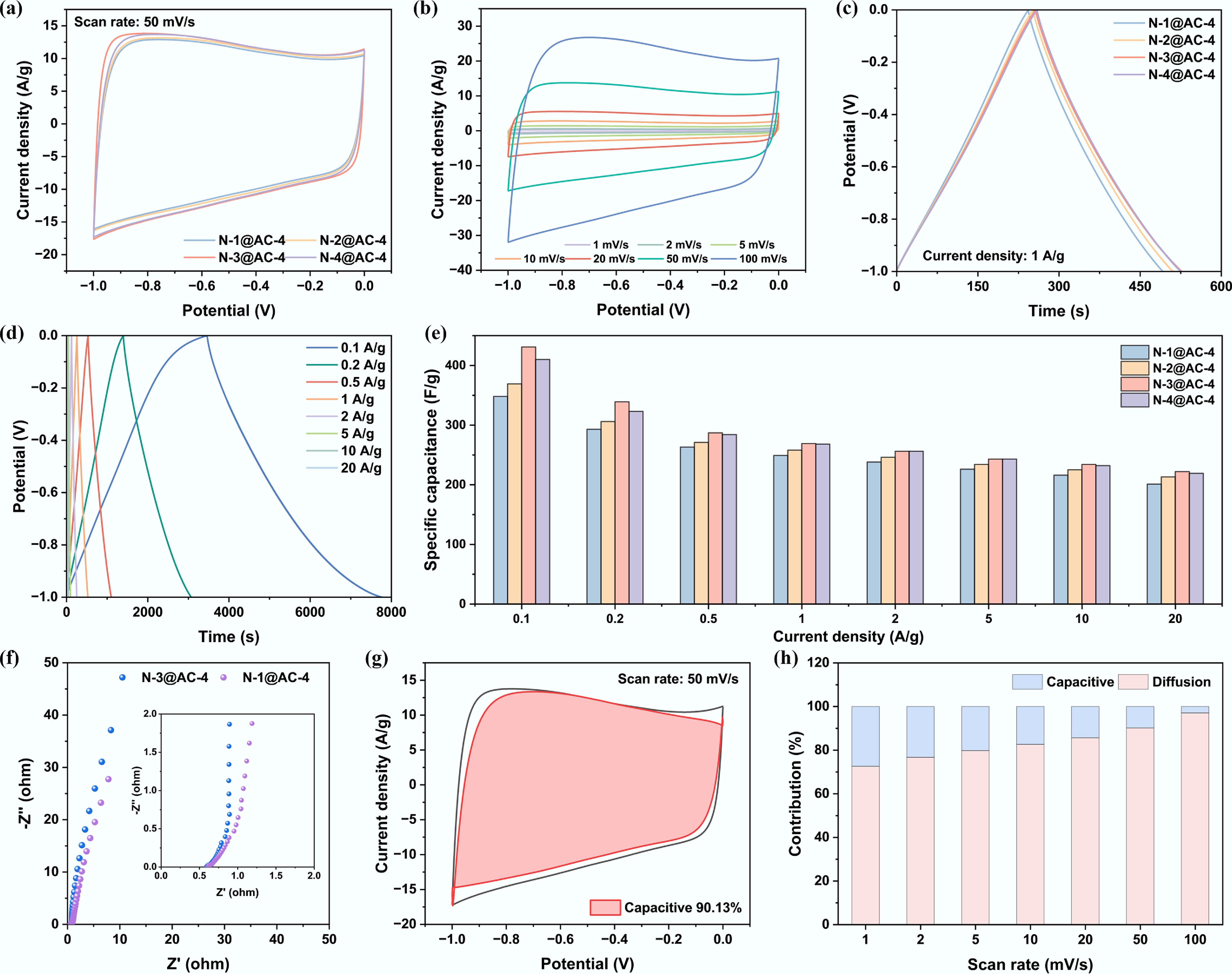 Influence of PU to lignin ratio on electrochemical performance in a three-electrode system: (a) Cyclic voltammogram curves at a scan rate of 50 mV s−1; (b) Cyclic voltammogram curves of N-3@AC-4 at different scan rates; (c) Galvanostatic charge and discharge curves at a current density of 1 A g−1; (d) Galvanostatic charge and discharge curves of N-3@AC-4 at different current densities; (e) Specific capacitance at different current densities; (f) Nyquist plots of N-1@AC-4 and N-3@AC-4; (g) Capacitive contribution of N-3@AC-4 at 10 mV s−1; and (h) Diffusion-capacitive contribution ratio of N-3@AC-4.