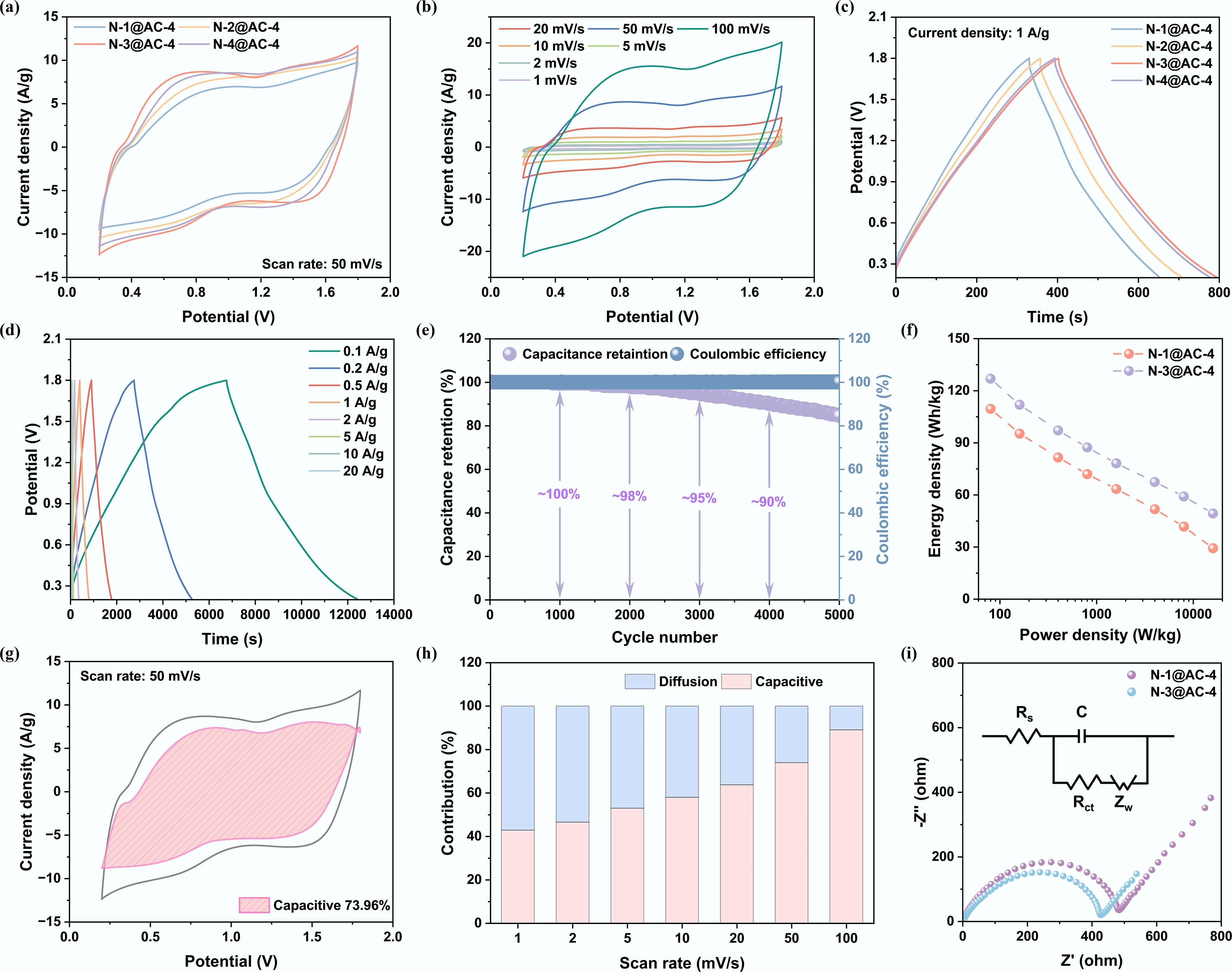Influence of PU to lignin ratio on electrochemical performance in ZIHCs: (a) Cyclic voltammogram curves at a scan rate of 50 mV s−1; (b) Cyclic voltammogram curves of N-3@AC-4 at different scan rates; (c) Galvanostatic charge and discharge curves at a current density of 1 A g−1; (d) Galvanostatic charge and discharge curves of N-3@AC-4 at different current densities; (e) Cycling performance of N-3@AC-4; (f) Energy-power density; (g) Capacitive contribution at 50 mV s−1; (h) Diffusion-capacitive contribution ratio of N-3@AC-4; and (i) Nyquist plots of N-1@AC and N-3@AC-4.