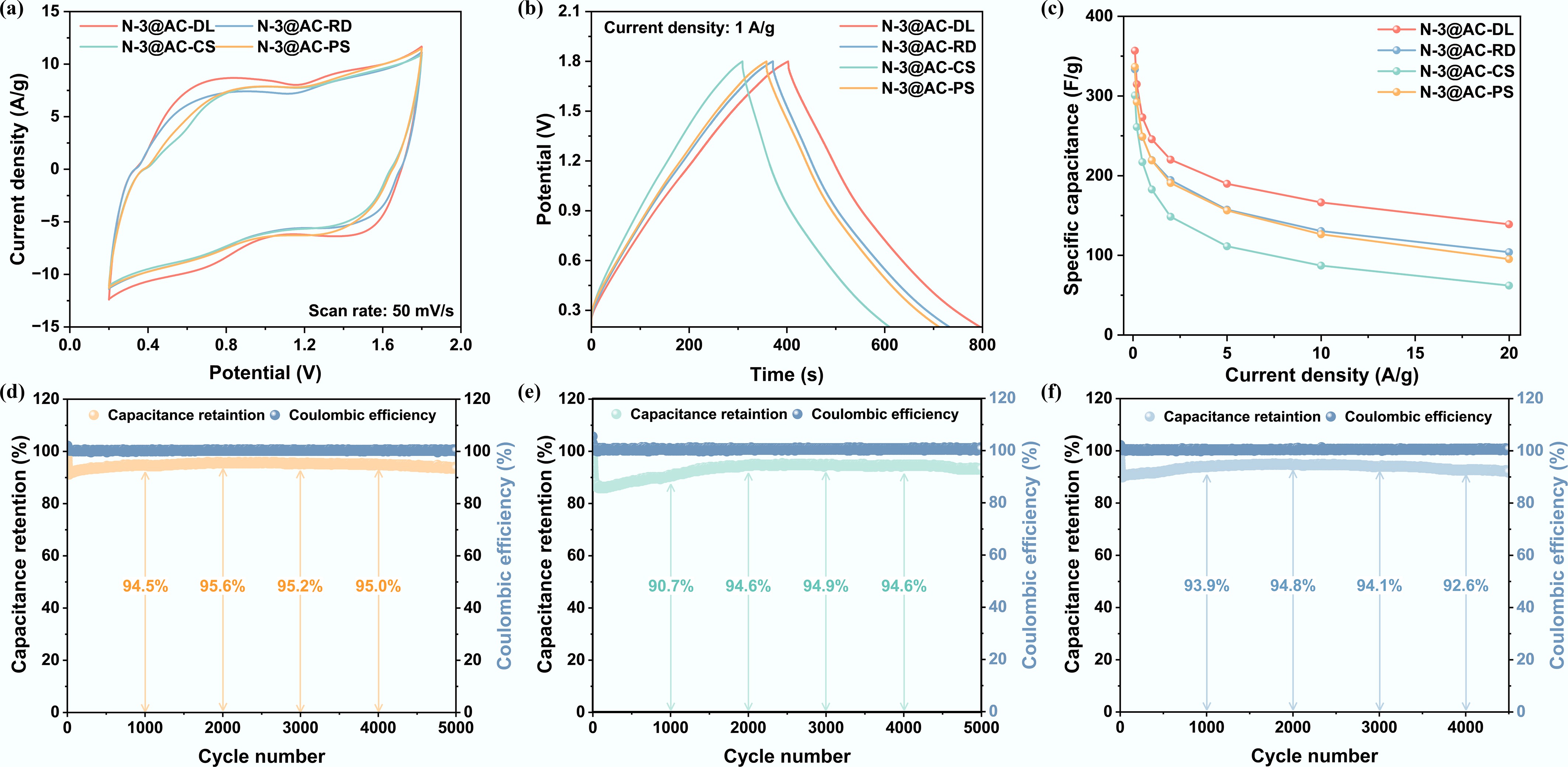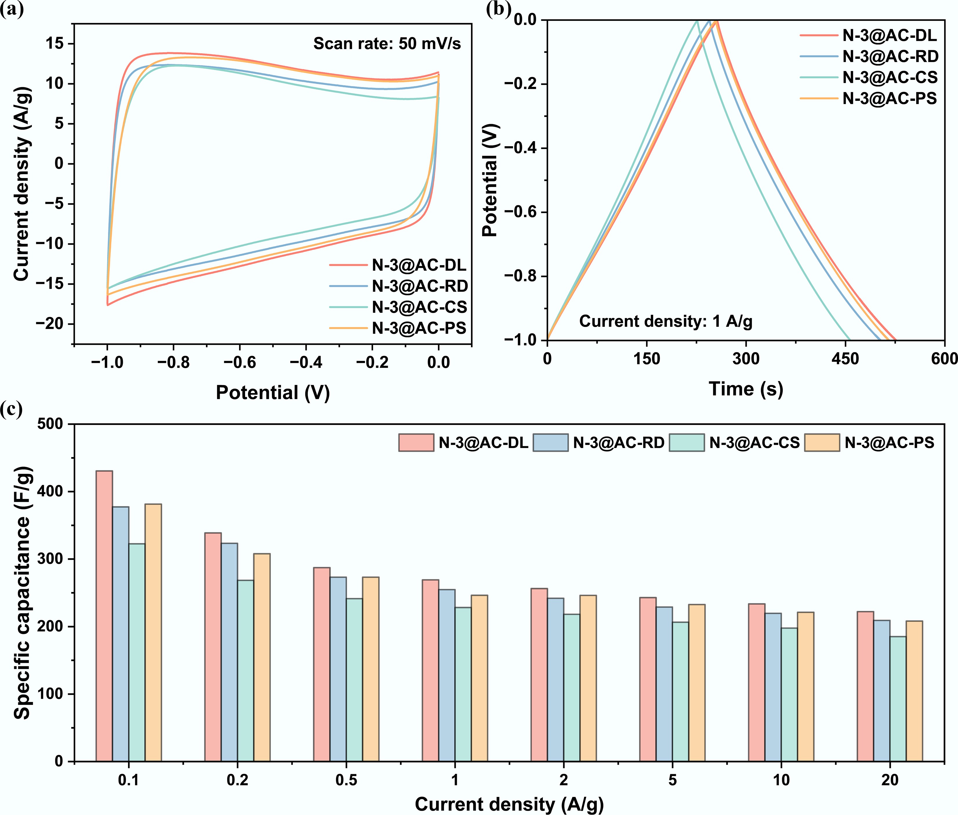 • Based on the established preparation conditions, this study systematically evaluated the feasibility of utilizing several representative biomass sources as precursors for high-performance electrode materials. The NHPCs synthesized from reed, corn stover, pine sawdust, and lignin under the optimized synthetic conditions were defined as N-3@AC-RD, N-3@AC-CS, N-3@AC-PS, and N-3@AC-DL, respectively. In the three-electrode system, the CV curves (Fig. 6a) showed a typical rectangular shape within the −1.0–0 V potential window, indicating that the charge storage mechanism was dominated by double-layer capacitors. The GCD curves (Fig. 6b) measured at a current density of 1 A g−1 presented a symmetrical isosceles triangle shape, indicating highly reversible capacitive behavior. The specific capacitances of the N-3@AC-RD and N-3@AC-PS were comparable to the N-3@AC-DL (Fig. 6c). Overall, biomass-derived carbonaceous materials showed promising commercial application prospects, attributed to their low cost combined with competitive electrochemical performance.