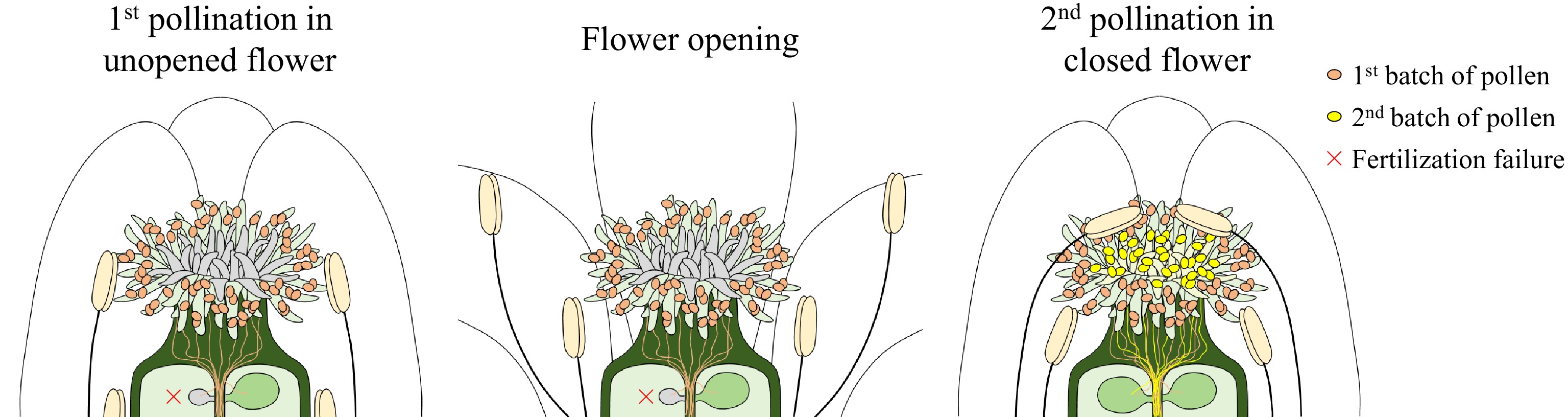 • The observation of floral opening and closure has a long history. In ancient Egyptian civilization, the water lily (Nymphaea), which blooms at dawn and closes at dusk, was revered as a 'symbol of the sun god Ra'. Since the mid-18th century, Carl Linnaeus systematically documented diurnal movements of floral organs in Philosophia Botanica[1], while renowned naturalists such as Augustin Pyramus de Candolle and Charles Darwin began investigating the physiological mechanisms underlying these floral rhythms[2]. Floral opening and closure are important features of the reproductive syndrome, facilitating pollen removal in male and bisexual flowers, as well as pollination, fertilization, and seed set in female and bisexual flowers[3]. The flowers of Arabidopsis thaliana open in the morning and close in the afternoon—a phenomenon so commonplace that it has long been overlooked—the biological significance underlying this phenomenon remains unexplored until now. A recent study by Liu et al. unveils an elaborate two-step self-pollination mechanism in Brassicaceae, dependent on petal closure, where coordinated growth and movement of petals, stamens, and pistils collectively enable this process[4]. This discovery challenges the conventional views of autogamy as a single, static event, elucidates how plants maximize fertility under pollen-limiting conditions and holds profound implications for both evolutionary biology and agricultural productivity.