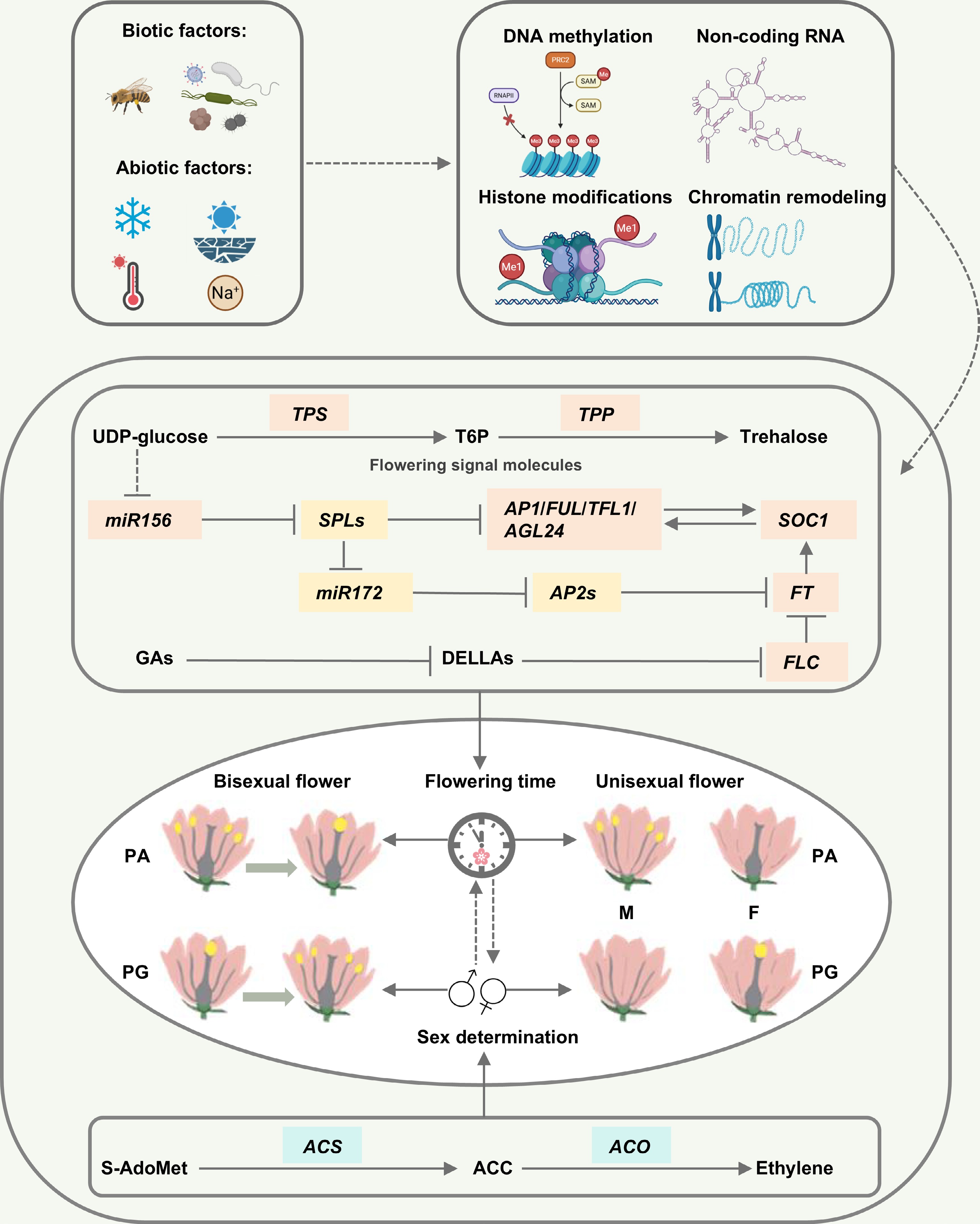The phenomenon of dichogamy may be associated with multiple factors, including biological interactions[3], environmental responses[57], gene expression[58], and epigenetics[59]. Under similar environmental conditions, dichogamous plants exhibit temporal rather than morphological differences during flower development, suggesting that genes regulating flowering time may play a more crucial role and deserve further attention. Moreover, once floral sexual differentiation is completed in dichogamous plants, the asynchrony in flowering time becomes evident through the distinct differences in the opening sequence of male and female inflorescences or individual flowers[60]. This indicates that the process of sex differentiation may influence flowering time at the population or individual level by altering the sex ratio of plants and the sequence of floral development[60]. Although direct evidence linking sex differentiation and flowering time in dichogamous plants is limited, studies on te regulation of sex expression in dioecious species and the temporal and spatial regulation of flower sex differentiation in dichogamous species can provide a theoretical framework for this field[60]. However, research on genes regulating flowering time and sex differentiation in dichogamous plants remains limited. Nonetheless, relevant studies in other plants, such as the model plant Arabidopsis thaliana, can offer insights into the factors affecting the mechanisms in dichogamous plants.