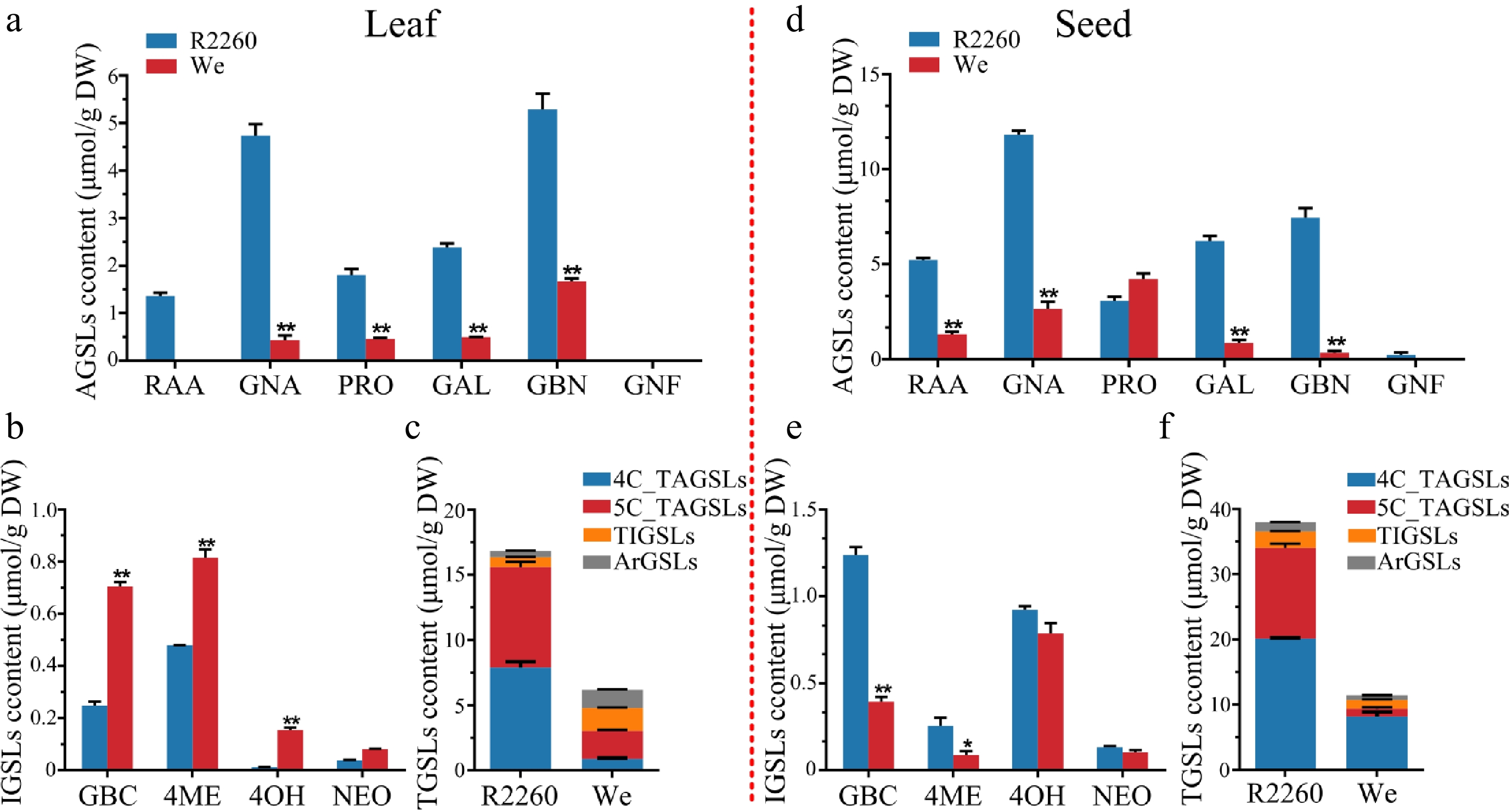 Content of glucosinolates in R2260 and Westar (We). (a), (d) Aliphatic glucosinolates (AGSLs) content in leaves and seeds; (b), (e) Indolic glucosinolates (IGSLs) content in leaves and seeds; (c), (f) Total glucosinolates (TGSLs) content in leaves and seeds. Each value is the mean of three replicates. The vertical bar indicates the standard error. Asterisks indicate significant differences (** p < 0.01, * p < 0.05).