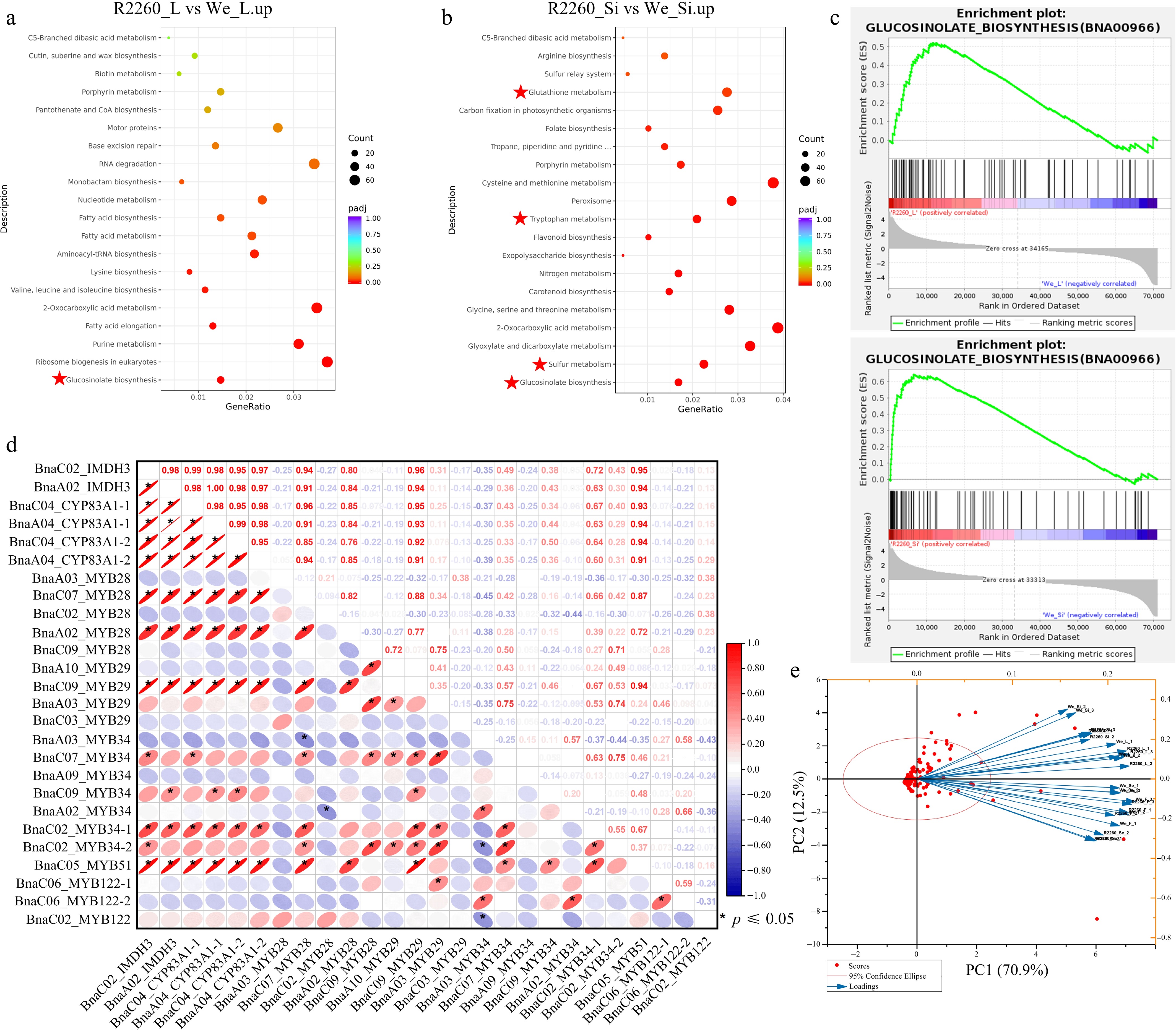 Transcriptome analysis of R2260 and Westar (We), in leaves (L), flowers (F), silique pericarps (Si), and seeds (Se). (a), (b) KEGG pathway enrichment analysis of differentially expressed genes between R2260-We. (c) Gene Set Enrichment Analysis (GSEA) of differentially expressed genes between R2260-We. (d) Pearson correlation analysis of BnaIMDH3, BnaCYP83A1, and the MYBs which contribute to glucosinolates biosynthesis. (e) Biplot of the principal component analysis of the observed FPKM values of glucosinolates biosynthesis pathway genes in R2260 and We, with leaves (L), flowers (F), silique pericarps (Si), and seeds (Se).