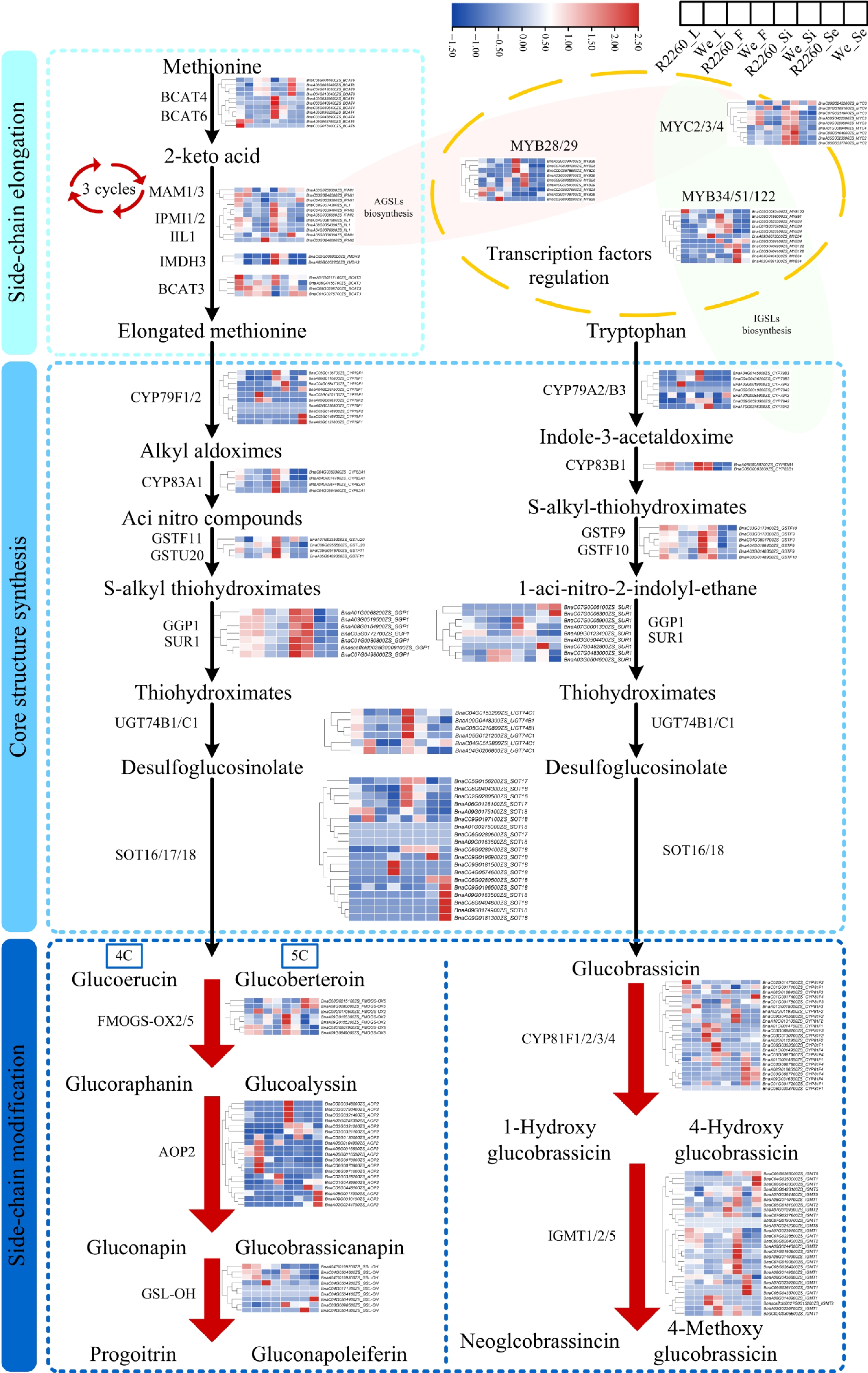 Expression profile of genes related to glucosinolates biosynthesis in R2260 and Westar (We) of leaves (L), flowers (F), silique pericarps (Si), and seeds (Se), the samples arranged from left to right as R2260_L, We_L, R2260_F, We_F, R2260_Si, We_Si, R2260_Se, We_Se. The FPKM values were used to draw heatmaps, and the red-to-blue gradient in the heatmaps indicates FPKM values from high to low, respectively. Each value is the mean of three replicates.