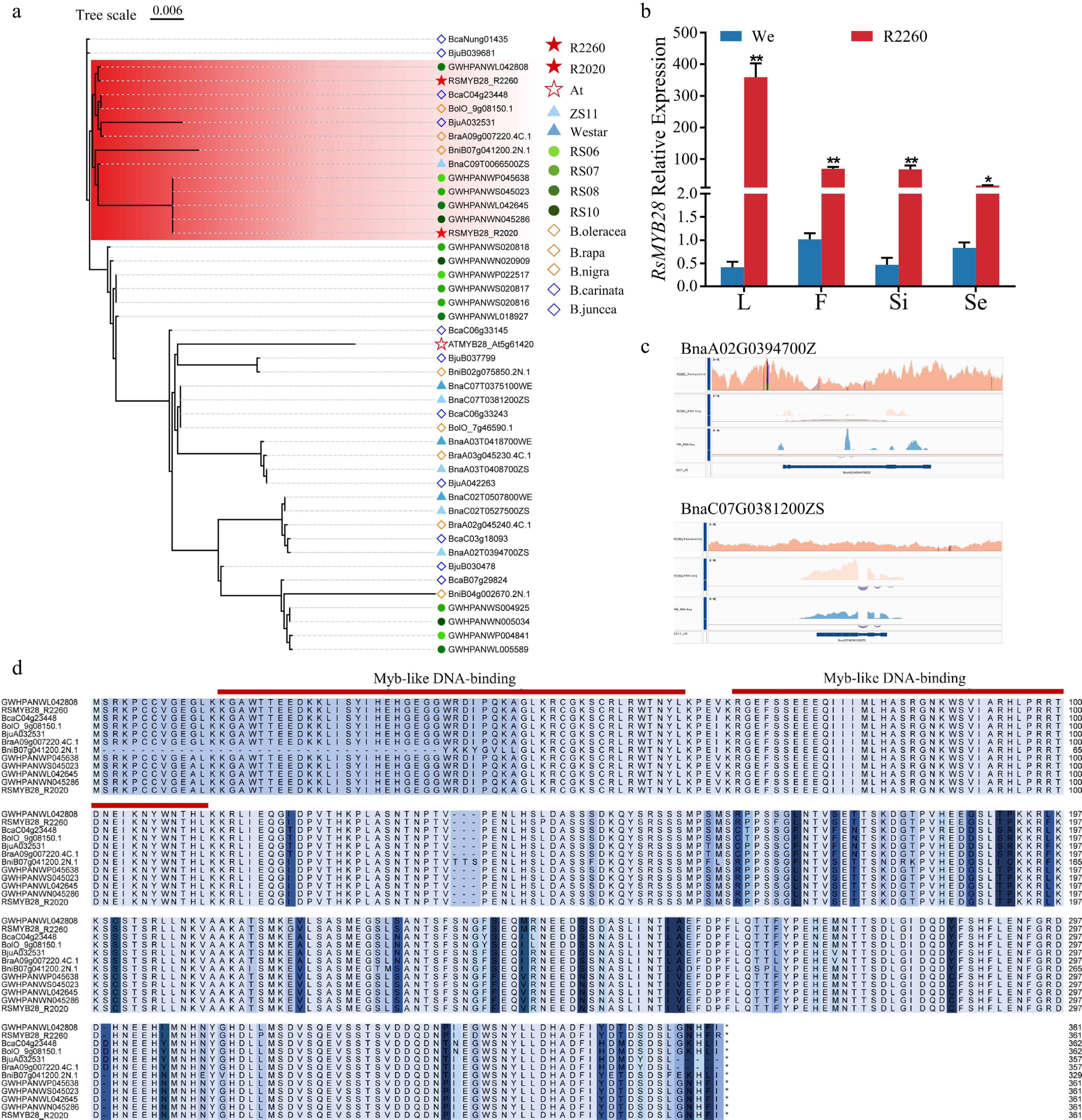 RsMYB28 identification and the sequences analysis. (a) Phylogenetic analysis of MYB28s from R2260, R2020, Arabidopsis thaliana (At), Brassica napus (ZS11 and Westar), Raphanus sativus (RS06, RS07, RS08, and RS10), B. rapa (chiifu V4), B. oleracea (OX-heart), B. nigra (Ni100_LR-v2.0), B. juncea (Tumida-T84-66-v1.5), and B. carinata (Zd-1-v1.0). (b) Relative expression of RsMYB28 in R2260 and Westar (We) of leaves (L), flowers (F), silique pericarps (Si), and seeds (Se). Each value is the mean of three replicates. The vertical bar indicates the standard error. Asterisks indicate significant differences (** p < 0.01, * p < 0.05). (c) The gene sequences alignment of BnaMYB28s in R2260, We, and ZS11 by IGV. (d) Multiple amino acid sequence alignment of RsMYB28s in Raphanus sativus (RS06, RS07, RS08, and RS10), B. carinata (Zd-1-v1.0), B. oleracea (OX-heart), B. juncea (Tumida-T84-66-v1.5), B. rapa (chiifu V4), and B. nigra (Ni100_LR-v2.0).