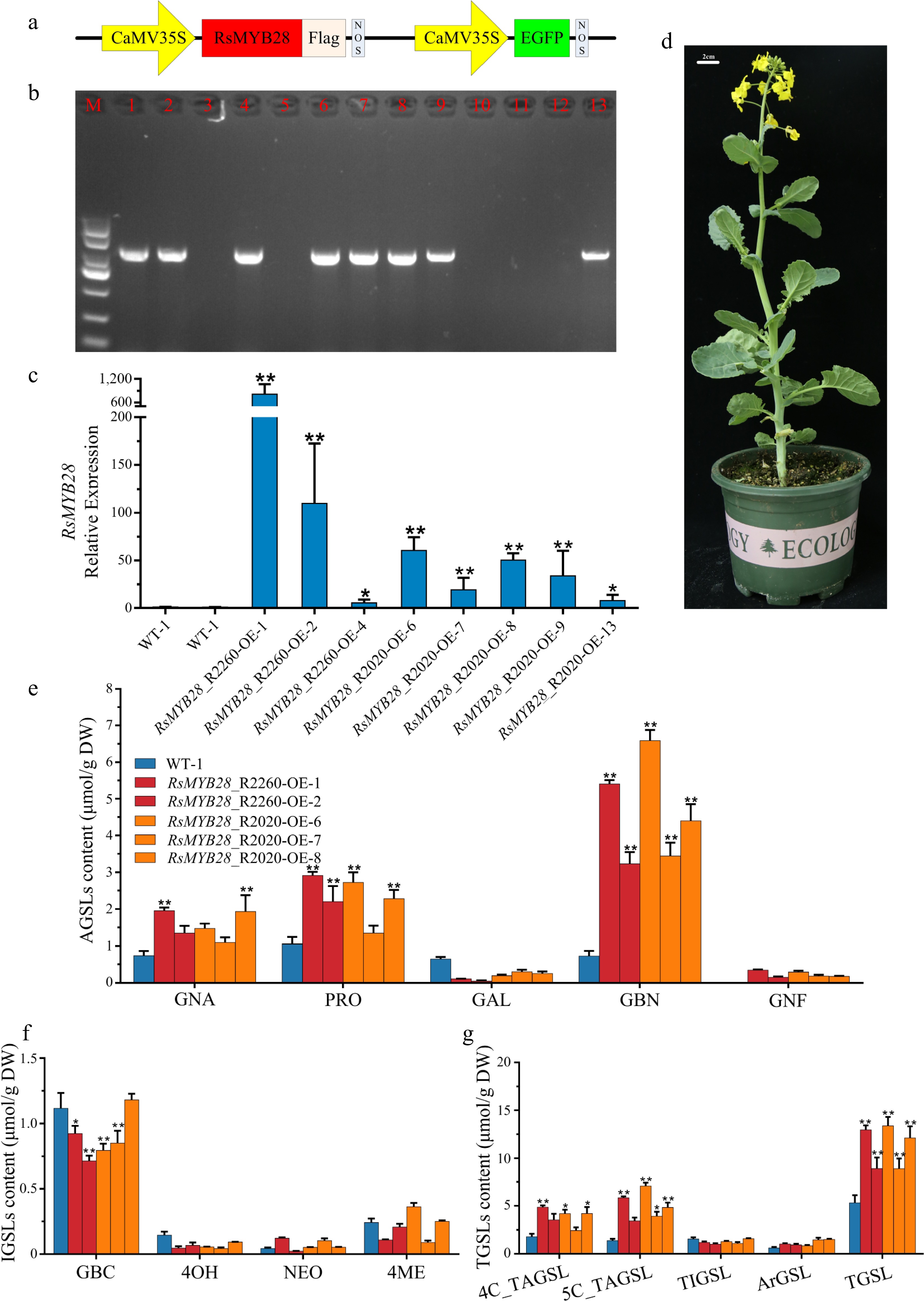 Biological function identification of RsMYB28. (a) Schematic diagram showing the constructs used for genetic transformation. (b) PCR identification of RsMYB28-overexpressing (RsMYB28-OE) transgenic lines. (c) Relative expression of RsMYB28 in overexpression lines and WT. (d) RsMYB28-OE transgenic plant. (e) The aliphatic glucosinolates (AGSLs) content in RsMYB28-OE lines and wild type (WT). (f) The indolic glucosinolates (IGSLs) content in RsMYB28-OE lines and WT. (g) The total glucosinolates (TGSLs) content in RsMYB28-OE lines and WT. Each value is the mean of three replicates. The vertical bar indicates the standard error. Asterisks indicate significant differences (** p < 0.01, * p < 0.05).