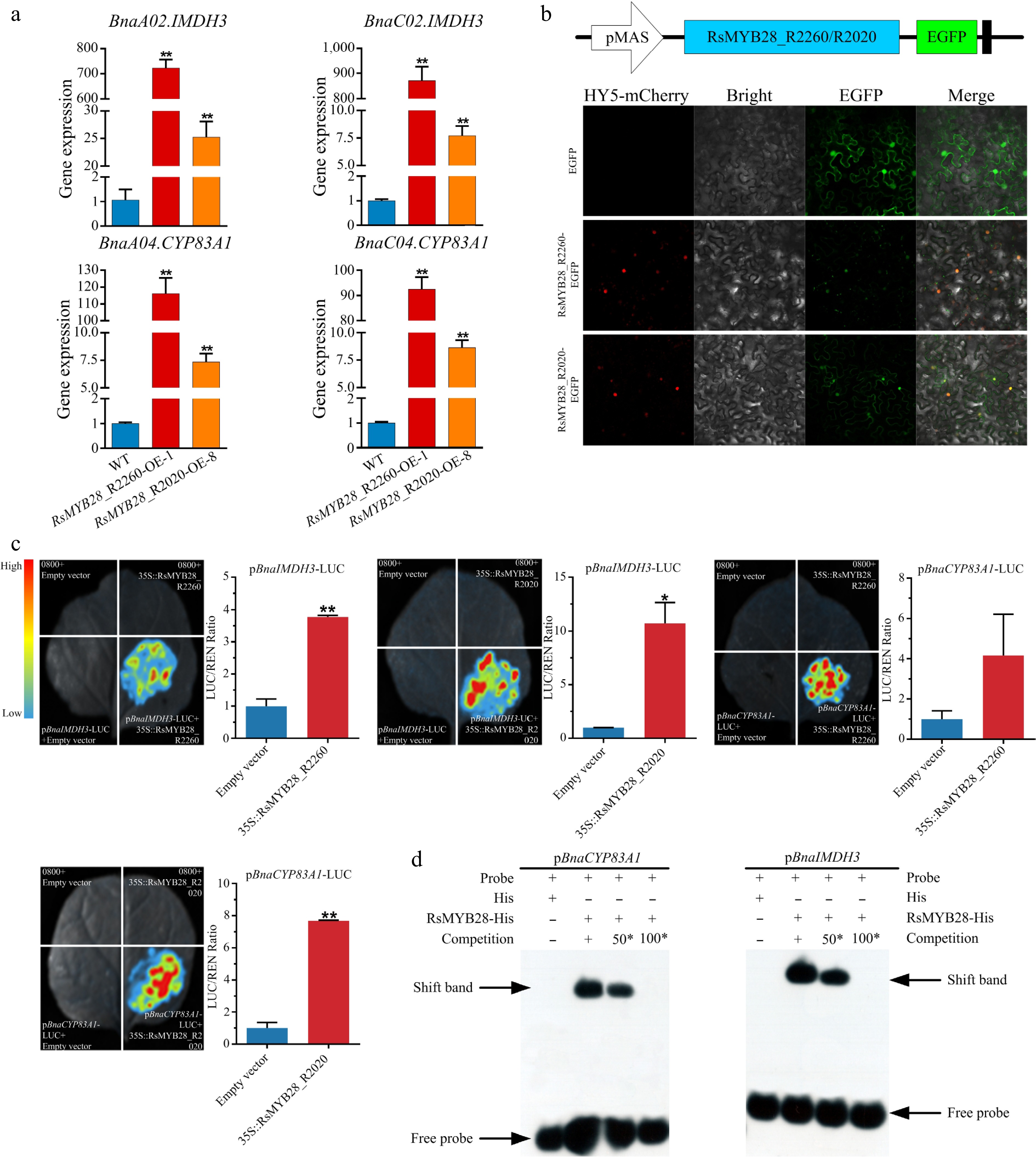 RsMYB28 directly interact with the promoters of BnaIMDH3 and BnaCYP83A1. (a) Relative expression of BnaIMDH3 and BnaCYP83A1 in RsMYB28-overexpressing (RsMYB28-OE) lines and wild type (WT). (b) Subcellular localization of RsMYB28 transcription factors. (c) Dual-luciferase reporter gene assay of RsMYB28 and promoters of BnaIMDH3 and BnaCYP83A1. (d) Electrophoretic mobility shift assay of RsMYB28, and promoters of BnaIMDH3 and BnaCYP83A1. Each value is the mean of three replicates. The vertical bar indicates the standard error. Asterisks indicate significant differences (** p < 0.01, * p < 0.05).