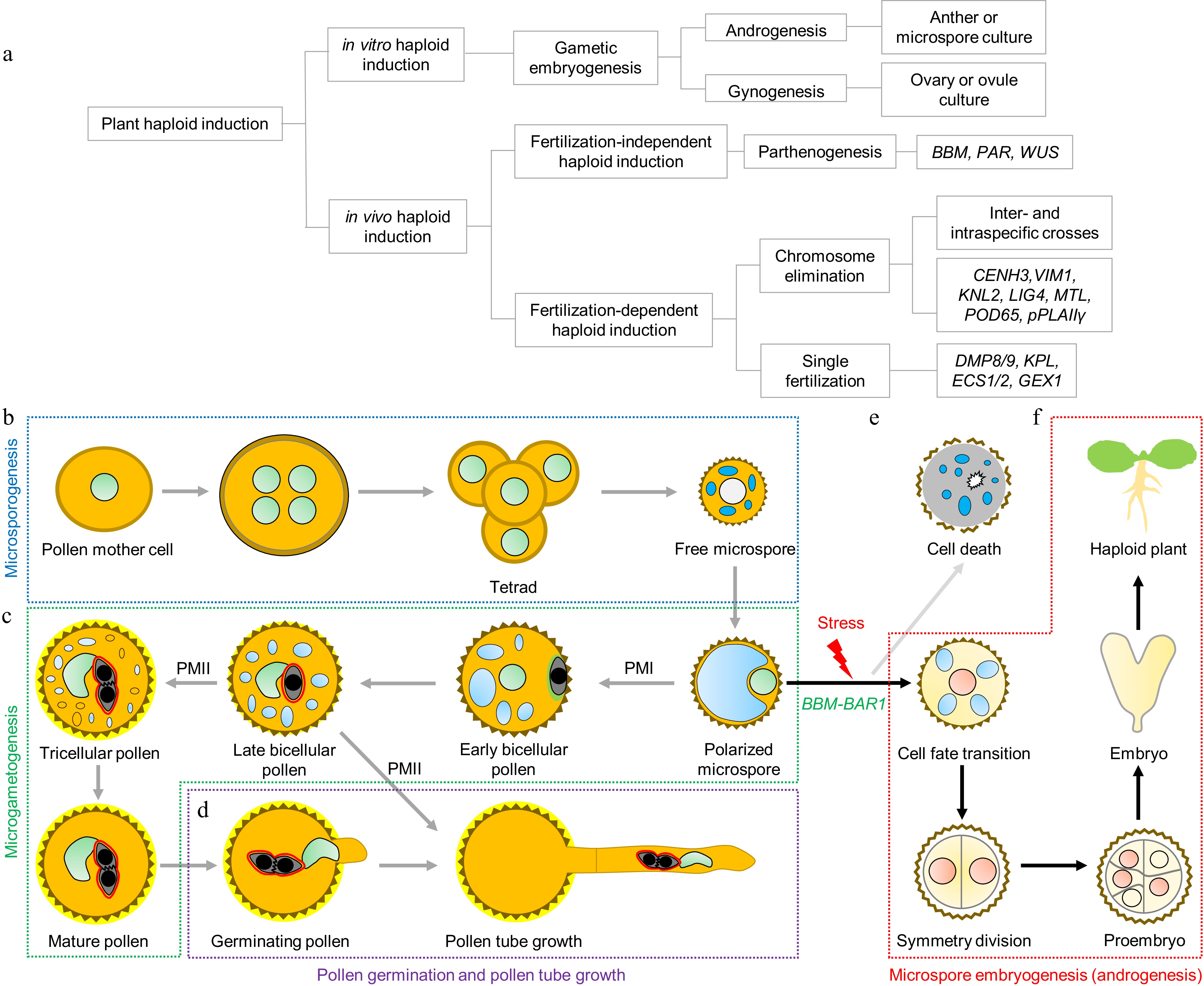 Haploid induction (HI) strategies and BBM-BAR1-mediated androgenesis. (a) Plant HI methods and classification. Plant HI approaches are broadly divided into in vivo and in vitro strategies. In vivo HI typically relies on haploid inducer lines generated through genetic manipulation or mutation of key genes, triggering the development of haploid embryos after fertilization. This category includes (i) parthenogenesis-based methods (via ectopic expression of transcription factors such as BABY BOOM [BBM], PARTHENOGENESIS [PAR], or WUSCHEL [WUS]), (ii) chromosome elimination-based methods (via inter- or intraspecific crosses or gene knockout), and (iii) single fertilization-based methods (via gene knockout). In vitro HI employs tissue culture to induce embryogenesis from gametophytic cells, including anther or microspore culture (androgenesis) and ovary or ovule culture (gynogenesis). (b) Microsporogenesis. Pollen mother cells undergo meiosis to form tetrads of four haploid microspores that are synchronously released. (c) Microgametogenesis. Free microspores develop into polarized microspores and undergo PM I to produce a large vegetative cell and a smaller generative cell that subsequently undergoes PM II to yield two sperm cells. (d) Pollen germination and tube growth. (e) Microspores that fail to transition to the proper developmental fate undergo programmed cell death. (f) Androgenesis. Under specific stress conditions, a subset of microspores can be reprogrammed toward embryogenesis, forming haploid embryos, depending on the BBM–BAR1 module.