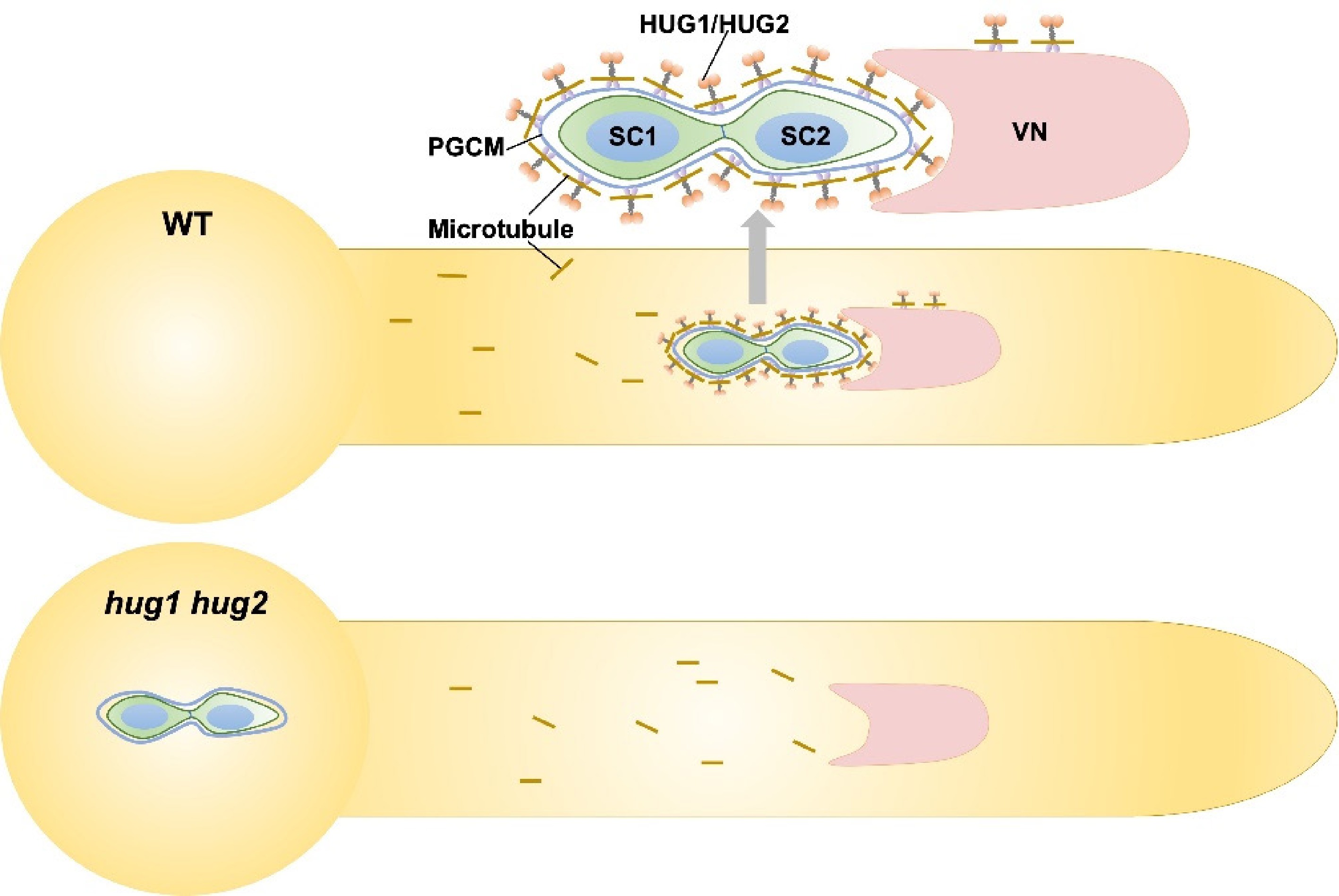 Working model of HUG1/2-mediated assembly of the MGU. Two immobile sperm cells (SC) are physically connected to a vegetative nucleus (VN), forming the MGU, which is transported as a single unit to the female gametophyte for fertilization. External to the peri-germ cell membrane (PGCM), a dual-layered cage structure comprising an inner microtubule cage and an outer HUG protein cage is required for the assembly of the MGU. Short brown lines indicate the microtubules.