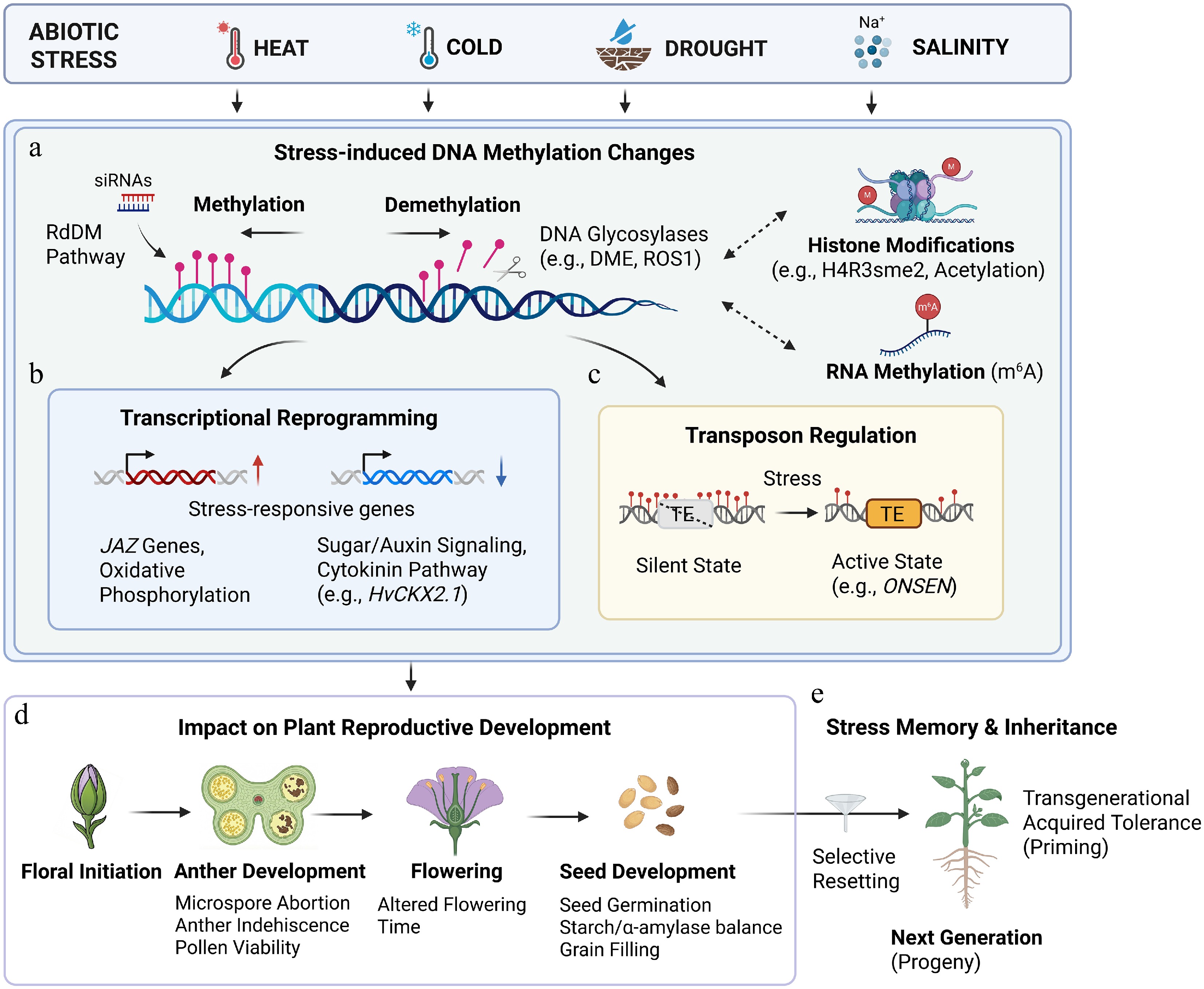 Abiotic stress-induced DNA methylation dynamics and their roles in plants' reproductive development and stress memory. (a) Abiotic stresses including heat, cold, drought, and salinity trigger dynamic changes in DNA methylation patterns. The regulation involves a balance between the RdDM pathway and active demethylation catalyzed by DNA glycosylases (e.g., DME and ROS1). These dynamic DNA methylation changes interact with histone modifications (e.g., H4R3 symmetric dimethylation and histone acetylation) and RNA methylation (m6A) to modulate the state of chromatin and gene regulation. (b) Stress-induced methylation changes lead to transcriptional reprogramming, including the upregulation of stress-responsive genes (e.g., JAZ genes, oxidative phosphorylation-related genes) and the downregulation of developmental pathways (e.g., sugar/auxin signaling, cytokinin pathway). (c) Altered methylation states also affect transposon regulation, enabling transitions from silenced to active states under stress conditions, exemplified by the activation of the heat-responsive retrotransposon ONSEN. (d) Stress-induced epigenetic alterations affect reproductive development, causing defects such as microspore abortion, anther indehiscence, pollen viability, altered flowering time, and impaired seed germination and grain filling. (e) Epigenetic modifications can form a somatic memory within the same generation or be transmitted to the next generation. Although some stress-induced epigenetic marks contribute to somatic memory or transgenerational acquired tolerance (priming) in the progeny, others undergo selective resetting to maintain genomic integrity. Created in BioRender. https://BioRender.com/zj6e1eq.