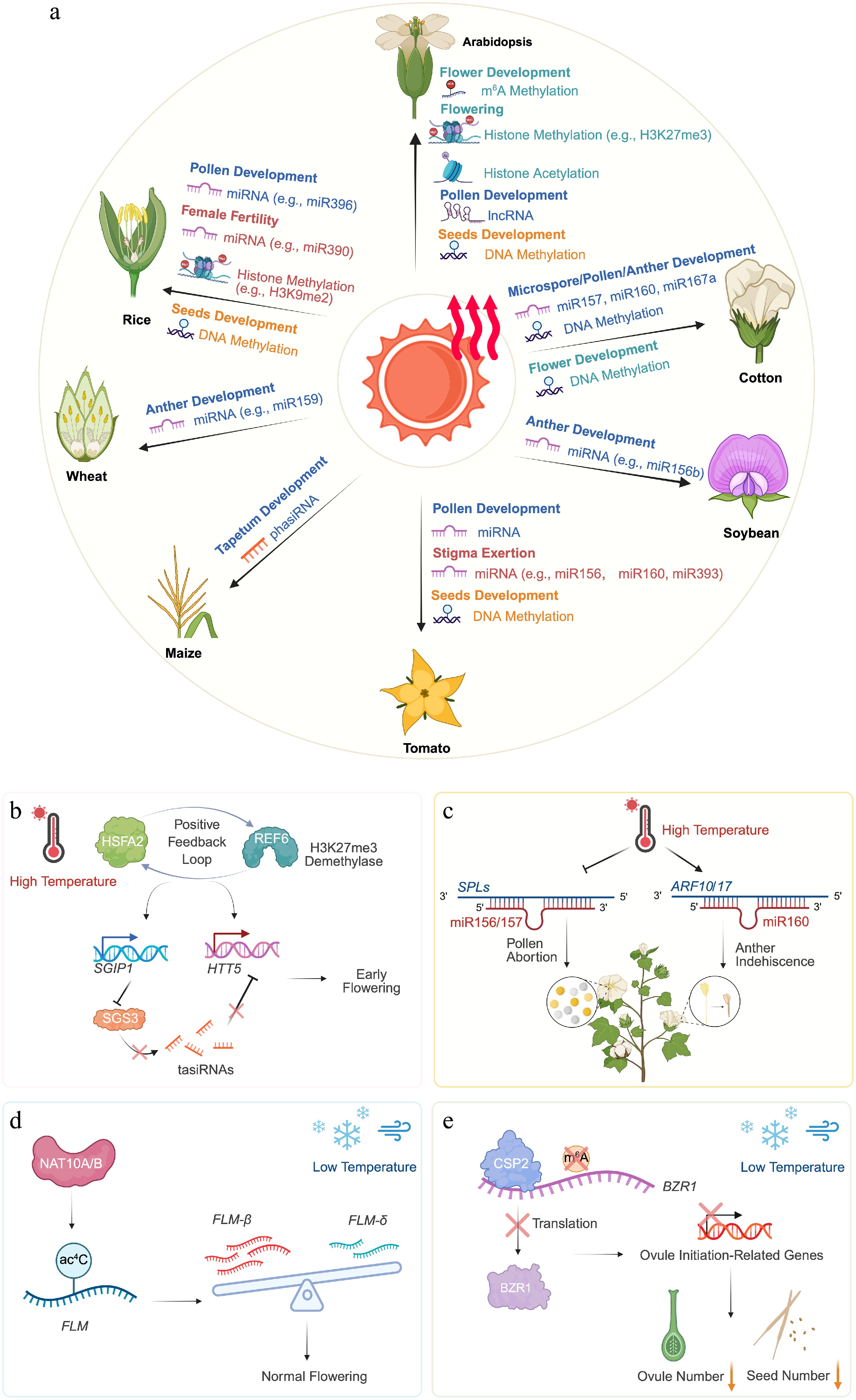 Epigenetic mechanisms safeguarding plant reproduction under abiotic stress. (a) Epigenetic regulation plays a pivotal role in maintaining the proper progression of sexual reproduction in plants under heat stress. Multiple epigenetic mechanisms are involved in modulating heat stress responses, including DNA methylation, histone methylation, and histone acetylation, as well as noncoding RNAs such as lncRNAs, miRNAs, and siRNAs. Together, these regulatory mechanisms influence flowering time and the development of floral organs and seeds. (b) The H3K27me3 demethylase REF6 establishes a positive regulatory feedback loop with the heat-responsive transcription factor HSFA2. This loop induces the expression of SGIP1, promotes degradation of SGS3, and consequently derepresses the tasiRNAs target HTT5, thereby contributing to heat-induced flowering. (c) In cotton, overexpression of miR157 or miR160 compromises auxin signaling, thereby enhancing the sensitivity of male fertility to heat stress and leading to microspore abortion or anther indehiscence. (d) Under low ambient temperatures, Arabidopsis NAT10A/B promote temperature-responsive ac4C deposition on FLM transcripts, thereby modulating alternative splicing of FLM and preventing extremely late flowering. (e) In Arabidopsis, brief exposure to chilling induces the RNA-binding protein CSP2, which binds to BZR1 mRNA and modulates its m6A modification, thereby reducing the mRNA translation efficiency of BZR1, inhibiting ovule initiation, and decreasing seed number. Created in BioRender. https://BioRender.com/l6d6j9a.