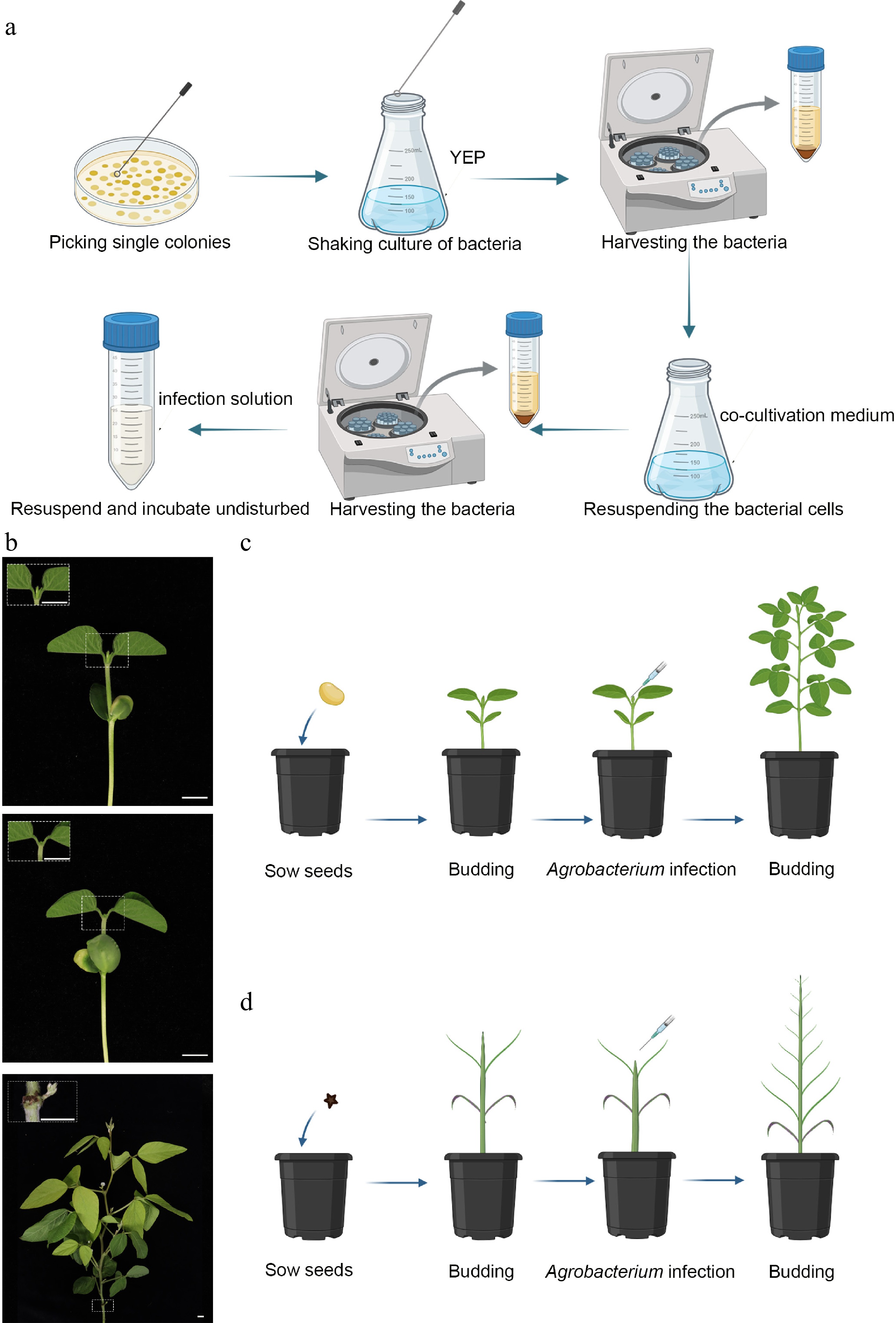 • To establish a direct delivery transformation system applicable to soybean and S. glauca, we adapted and optimized the co-cultivation medium and infection procedure described by Maher et al.[6]. The apical buds of soybean and S. glauca seedlings were selected as the infection sites. (Fig. 1). The apical meristem of the plants was infected with the Agrobacterium suspension using a syringe. (Fig. 1b, c). After inoculation, plants were subjected to dark co-cultivation and then grown under species-specific conditions. During cultivation, axillary buds emerging from nonwounded sites were removed.