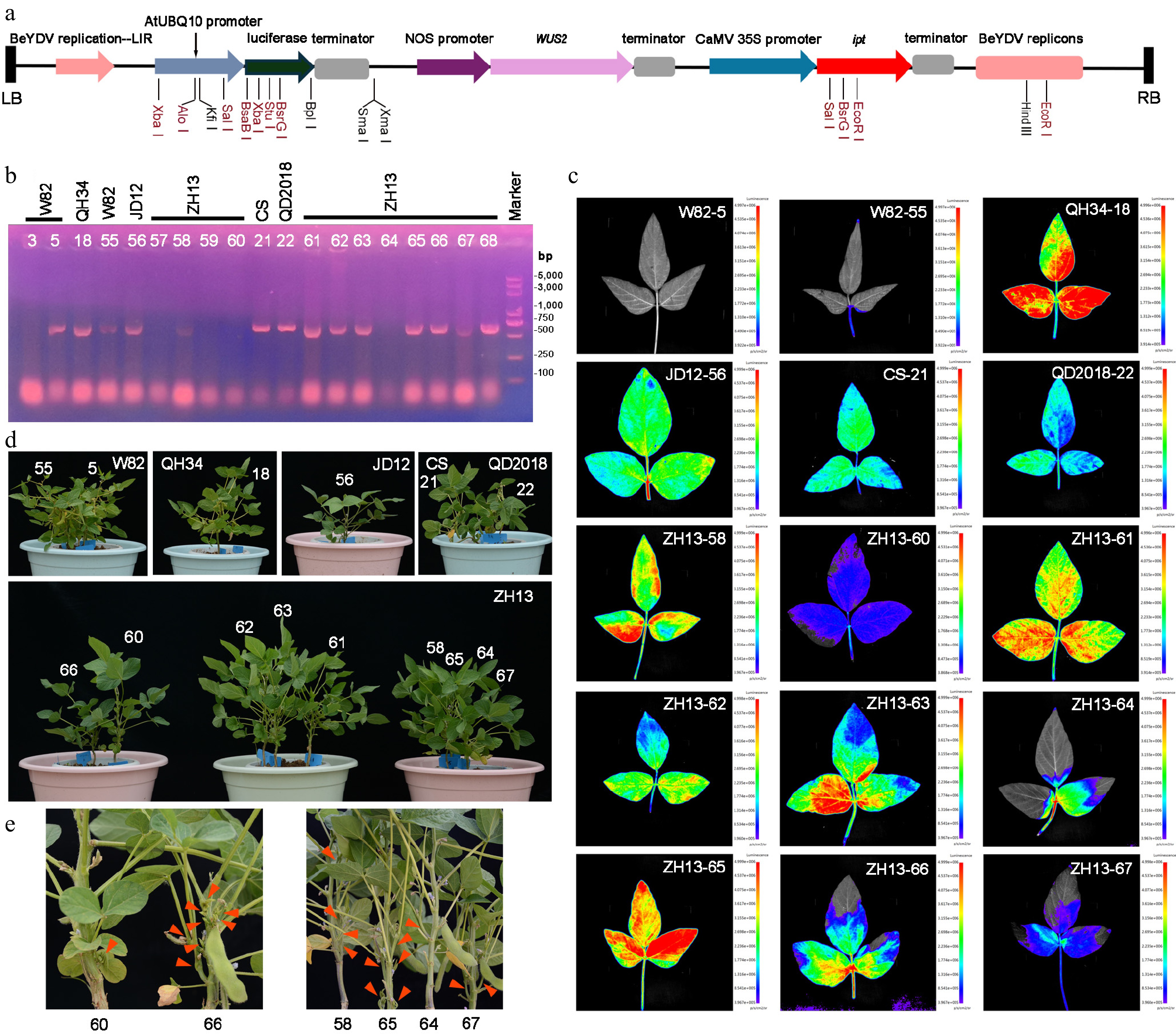 Using the optimized protocol, the pMKV057 vector harboring LUC, WUS2, and ipt[6] was introduced into multiple soybean cultivars via A. tumefaciens strain EHA105. Transgenic plants were identified by ipt-specific PCR, yielding an overall positive transformation frequency of 73.7% (PCR-positive plants/total inoculated plants) (Fig. 2b). In addition, luciferase fluorescence signals were detected in the majority of leaves (Fig. 2c). Compared with the nontransgenic control plants, positive transformants displayed normal growth and development and were able to flower and set seeds successfully (Fig. 2d, e).