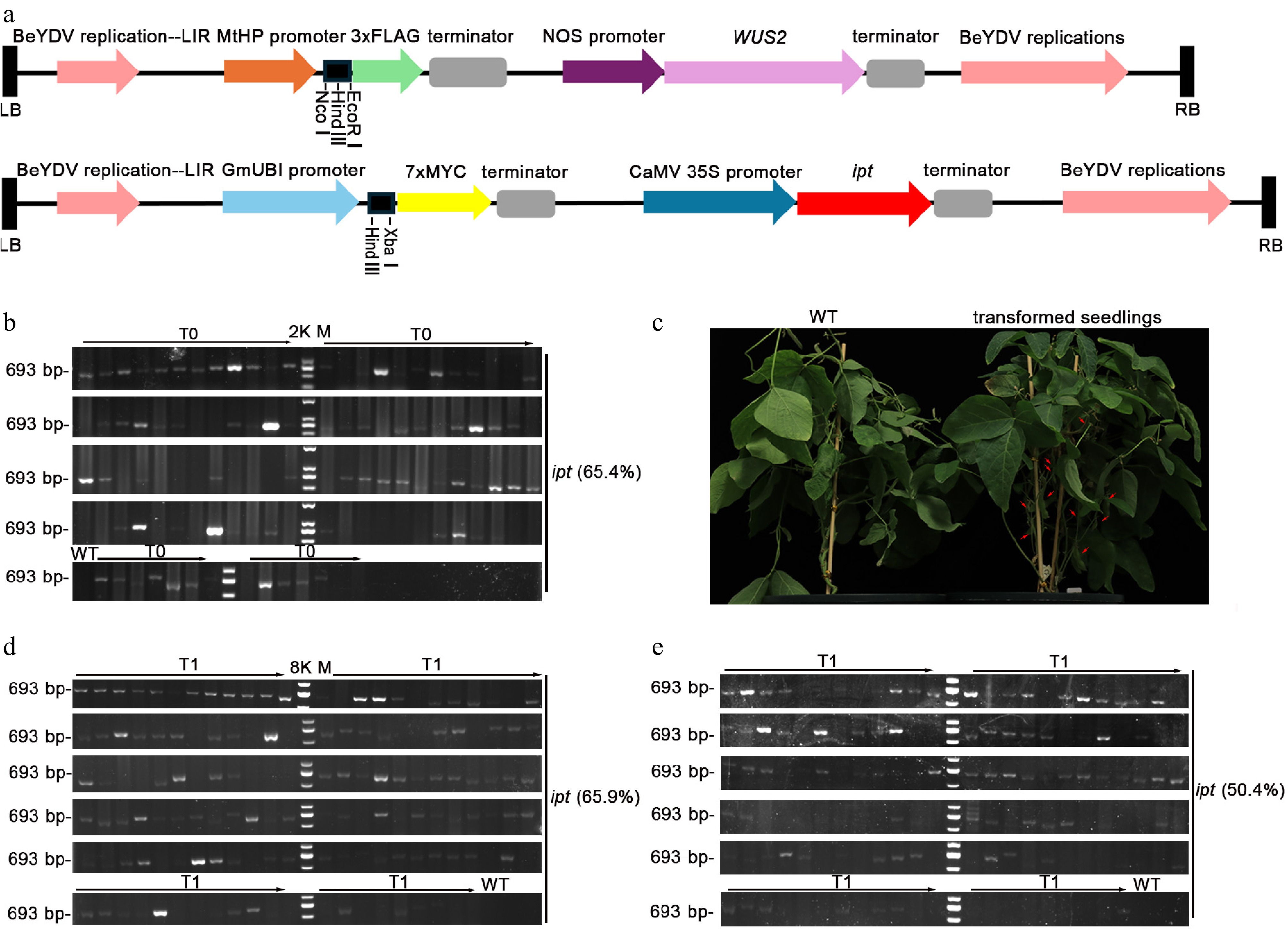 Because the original pMKV057 backbone limited modular cloning and lacked unique sites suitable for straightforward replacement of the LUC cassette, we generated derivative vectors to increase cloning flexibility and cargo capacity. Specifically, two constructs separately expressing WUS2 and ipt were generated. The LUC expression cassette was removed and replaced with modular expression cassettes incorporating epitope tags (FLAG and MYC) to facilitate detection of heterologous proteins, whereas the original promoter was replaced with a legume-active promoter. In addition, the multiple cloning site (MCS) was redesigned to include unique, high-efficiency restriction sites, and an optimal Kozak sequence was inserted immediately upstream of the MCS to support efficient translation, multigene assembly, and co-transformation. Redundant restriction sites outside the MCS were eliminated without altering the encoded amino acid sequence, thereby facilitating the subsequent co-transformation of exogenous genes (Fig. 2a, 3a). When the modified vectors were introduced into the soybean germplasm 'ChiDou' via A. tumefaciens GV3101-mediated transformation, the transformation-positive frequency reached 57.6%–65.4%, and the ipt-positive shoots exhibited normal development and seed set (Fig. 3b, c, Supplementary Fig. S2, Supplementary Table S2). Furthermore, application of this system to S. glauca resulted in a ipt-positive transformation rate of 73.1% (Fig. 4a).