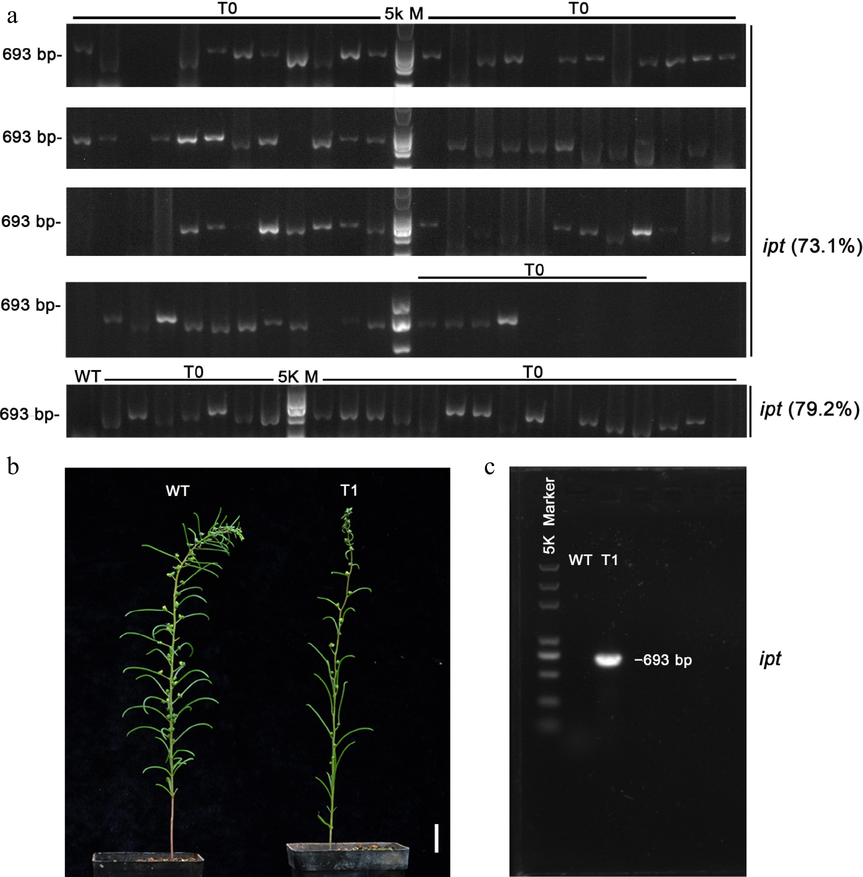 Identification of T1 transgenic S. glauca seedlings. (a) Identification of T0 transgenic S. glauca. Transformation-positive frequency = number of PCR-positive plants (68)/total number of surviving inoculated plants (93) = 73.1%. Transformation-positive frequency = number of PCR-positive plants (19)/total number of surviving inoculated plants (24) = 79.2%. This experiment was independently repeated twice, and representative experimental data are presented in this study. (b) Phenotype of T1 transgenic S. glauca. Scale bar = 1 cm. (c) Detection of the ipt gene in T1 transgenic S. glauca.