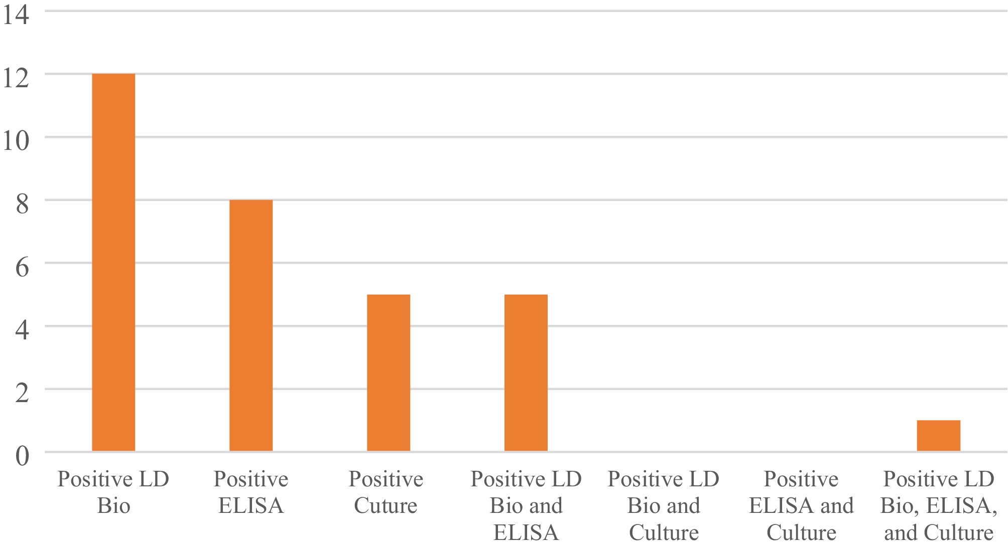 Diagnostic Culture Sensitivity Specificity Positive predictive value Negative predictive value Accuracy Yes No ELISA Positive 2 (6.9%) 9 (31.0%) 40.00% 62.50% 18.18% 83.33% 58.62% Negative 3 (10.3%) 15 (51.7%) Bold values indicate positive predictive value and accuracy as key diagnostic parameters. -