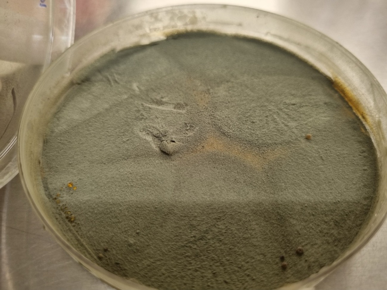 Among the positive fungal cultures, the identified species included Aspergillus niger, Aspergillus fumigatus, Aspergillus flavus, Candida sp., and Penicillium sp. Aspergillus fumigatus was the most frequently isolated species among patients with probable chronic pulmonary aspergillosis (CPA). These results highlight the predominance of fungal species commonly implicated in CPA among post-TB individuals. Figure 2 illustrates the typical colony morphology of Aspergillus fumagatus isolated from one of the patient specimens in this study.