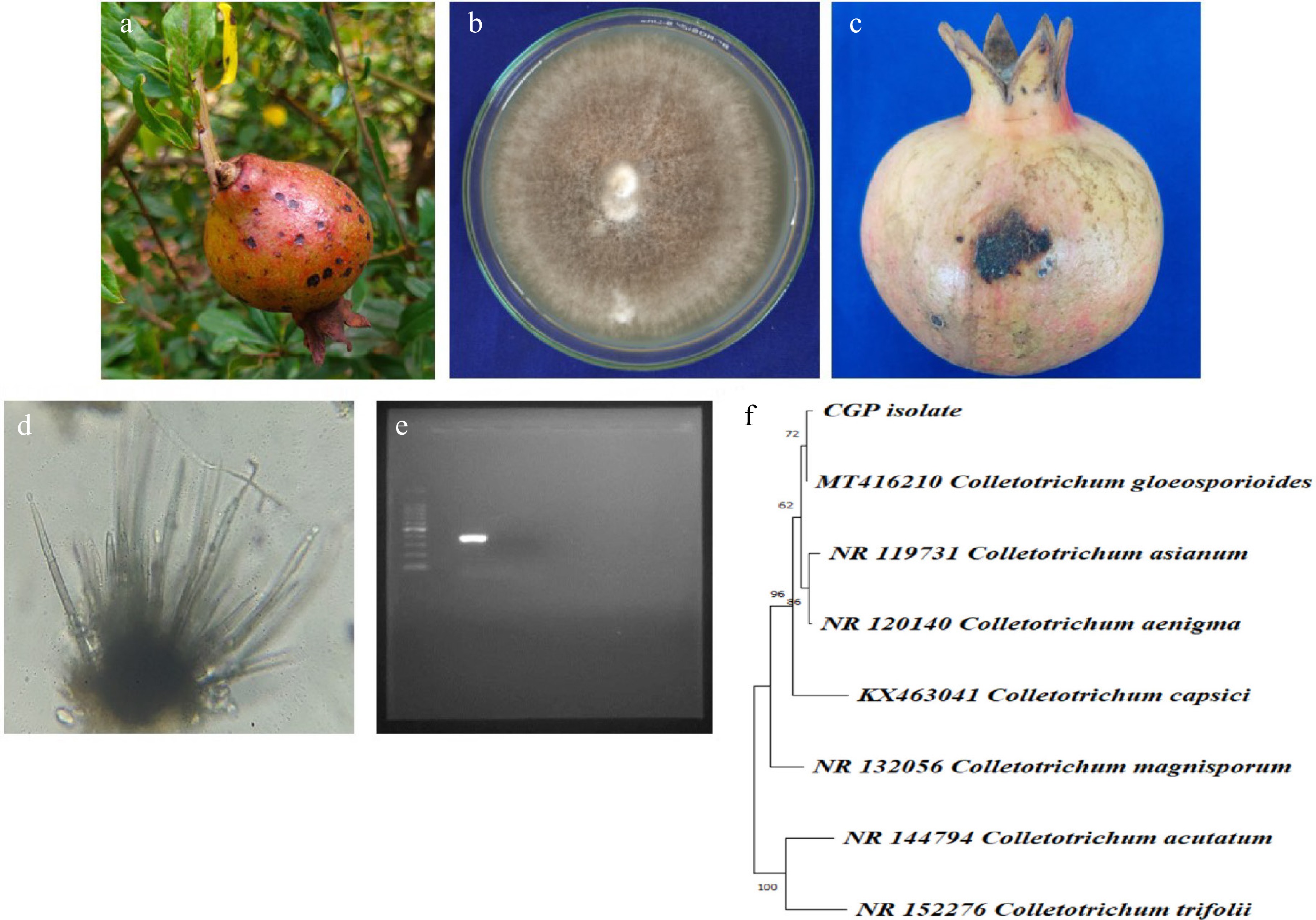 (a) Symptoms on fruit. (b) Pure culture of pathogen. (c) Pathogenicity on mature fruit. (d) Acervuli. (e) ~380 band size on agarose gel. (f) Phylogenetic analysis.