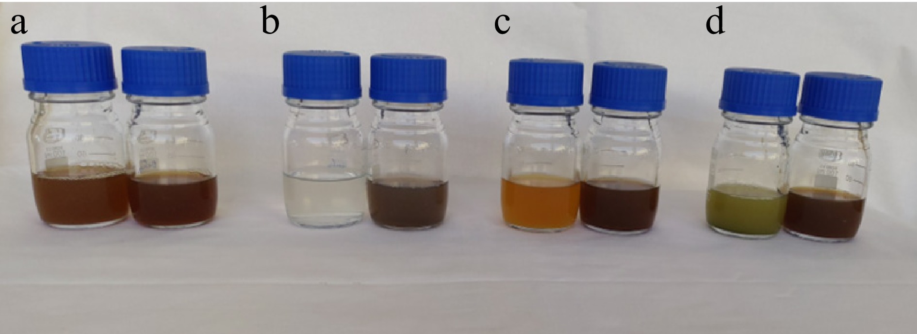 Change of colour as an indication of silver nanoparticles synthesis. (a) D. metel extract and AgNPs, (b) M. oleifera extract and AgNPs, (c) A. sativum extract and AgNPs, (d) P. julifera extract and AgNPs.