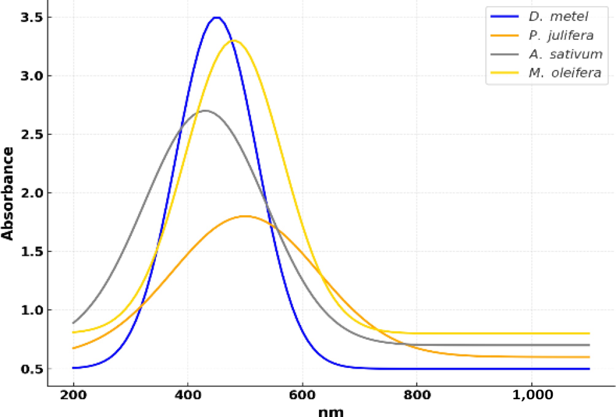 • The successful synthesis of silver nanoparticles was confirmed through UV-visible (UV-Vis) spectrophotometric analysis. All four plant extract-mediated AgNP samples exhibited strong absorption peaks in the range of 420 to 500 nm, which is characteristic of the surface plasmon resonance (SPR) of silver nanoparticles. This optical property arises from the collective oscillation of free electrons on the nanoparticle surface in response to light excitation, confirming the formation of AgNPs in the colloidal suspension. Specifically, the UV–Vis spectra revealed distinct peaks at approximately 444 nm for D. metel-AgNPs, 432 nm for A. sativum-AgNPs, 453 nm for M. oleifera-AgNPs, and 446 nm for P. juliflora-AgNPs (Fig. 3). The slight variation in peak positions among the different extracts may be attributed to differences in particle size, shape, and surface chemistry influenced by the phytochemical composition of each botanical.