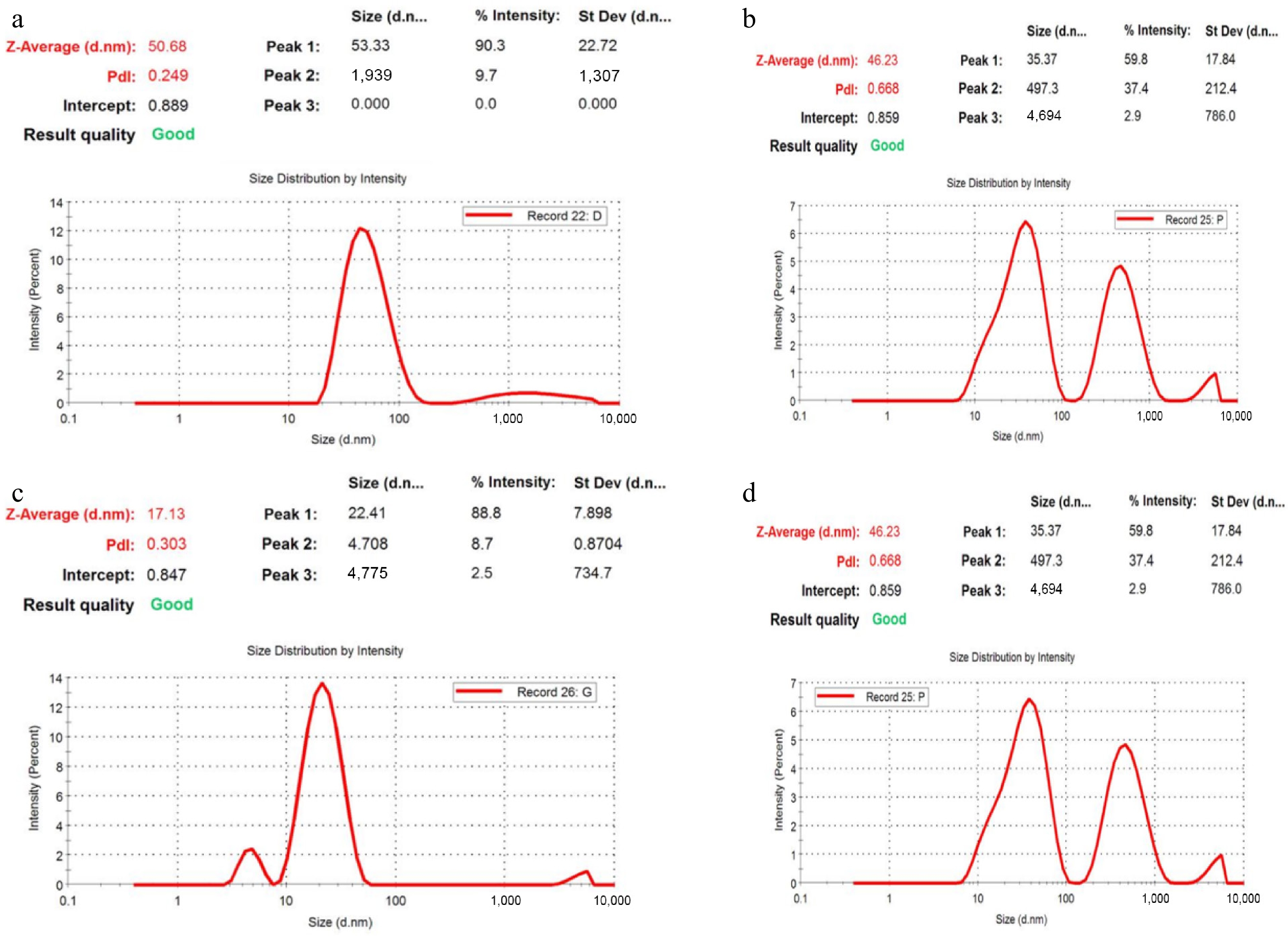 • The size distribution and stability of the green-synthesized silver nanoparticles were analyzed using dynamic light scattering (DLS) with a zeta particle size analyzer. The average particle sizes of AgNPs synthesized from D. metel, A. sativum, M. oleifera, and P. juliflora were found to be 50.68, 17.13, 43.90, and 46.23 nm, respectively (Fig. 4). Among the four botanicals, A. sativum-derived nanoparticles exhibited the smallest size, indicating a more efficient nucleation process possibly influenced by the specific phytochemicals present in the garlic extract. In contrast, the largest particle size was recorded for AgNPs synthesized using D. metel, suggesting a slower reduction process or differences in the capping and stabilizing abilities of the extract.
