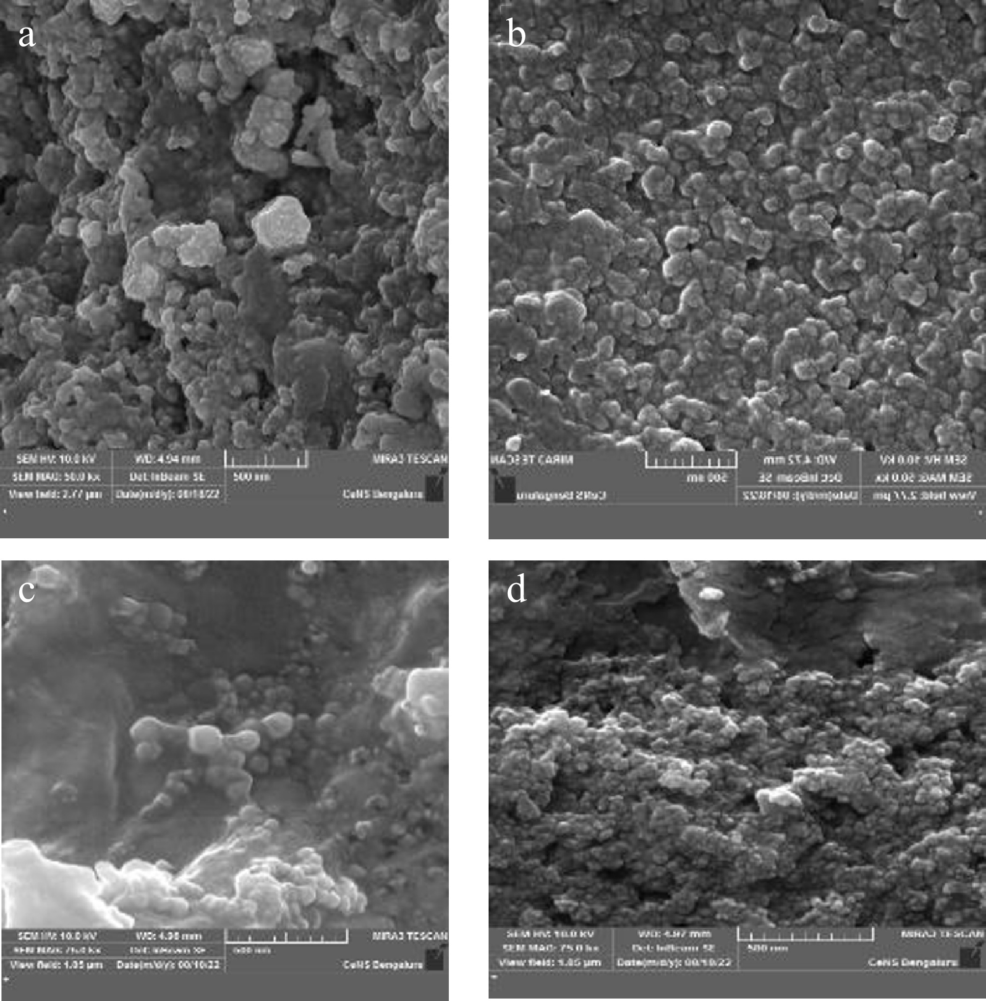 Field emission scanning electron microscopy (FESEM) image of green synthesized silver nanoparticles. (a) D. metel, (b) A. sativum, (c) M. oleifera, (d) P. julifera.
