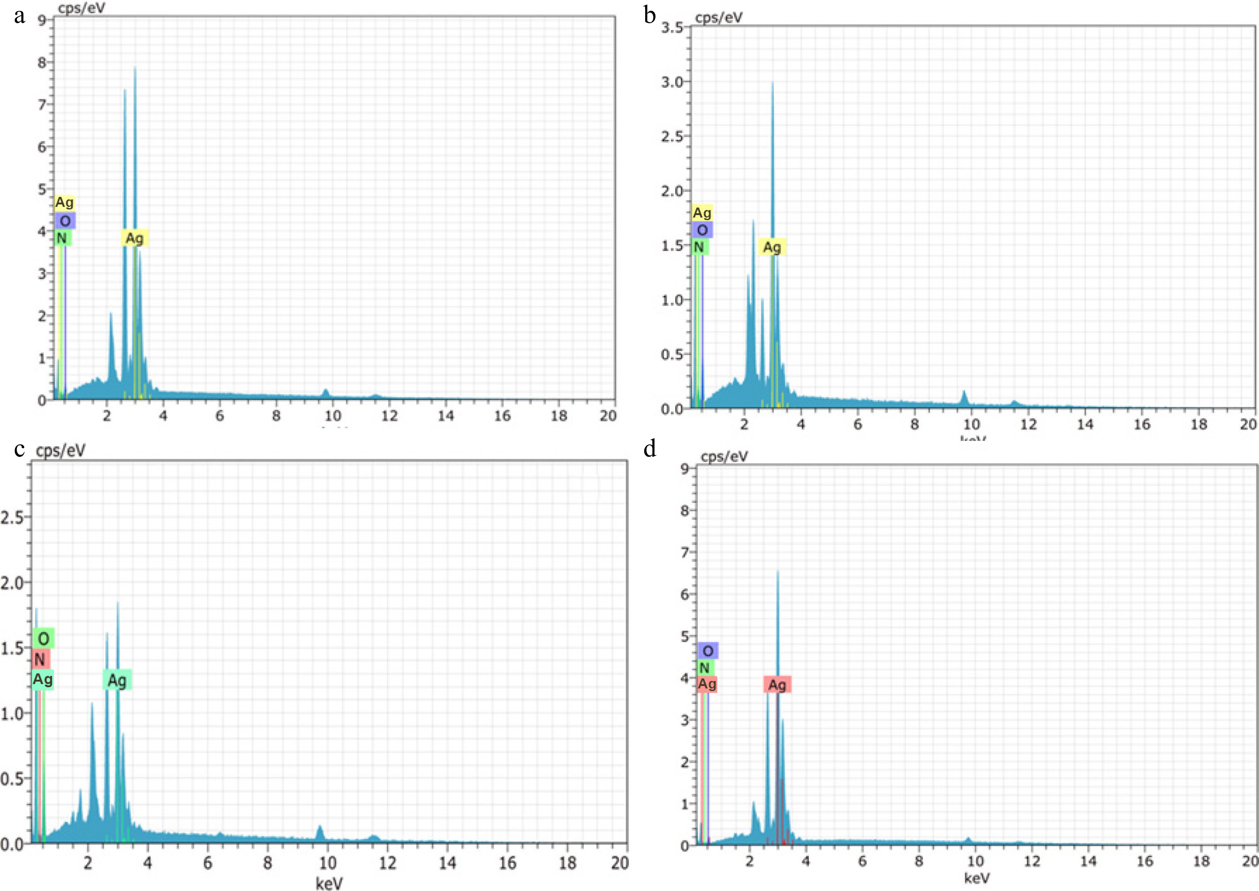 Energy Dispersive X-Ray Spectroscopy (EDX) spectra of green silver nanoparticles synthesized from (a) D. metel, (b) A. sativum, (c) M. oleifera, (d) P. julifera.