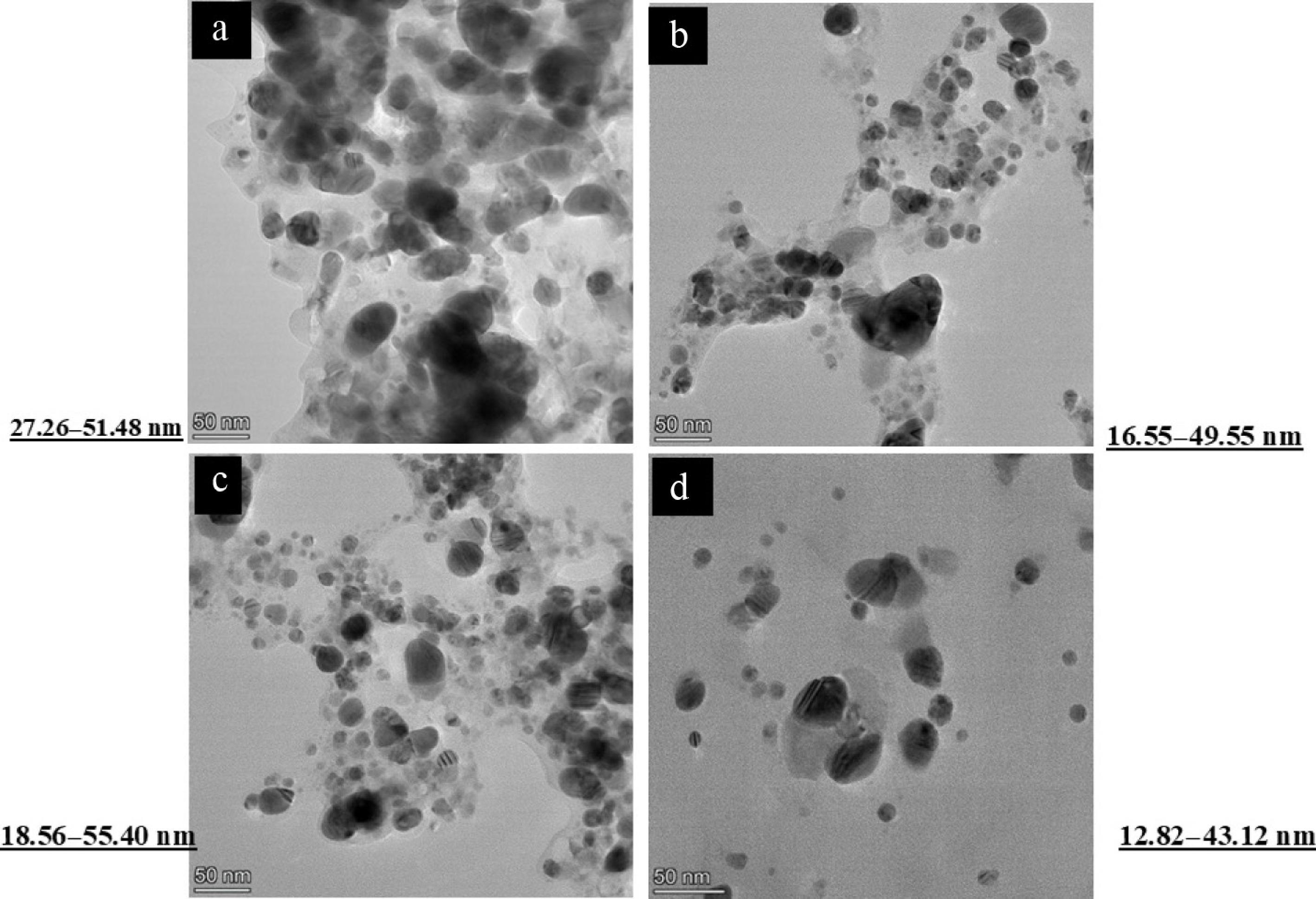 Transmission Electron Microscope (TEM) image of green silver nanoparticles synthesized from (a) D. metel, (b) A. sativum, (c) M. oleifera, (d) P. julifera.