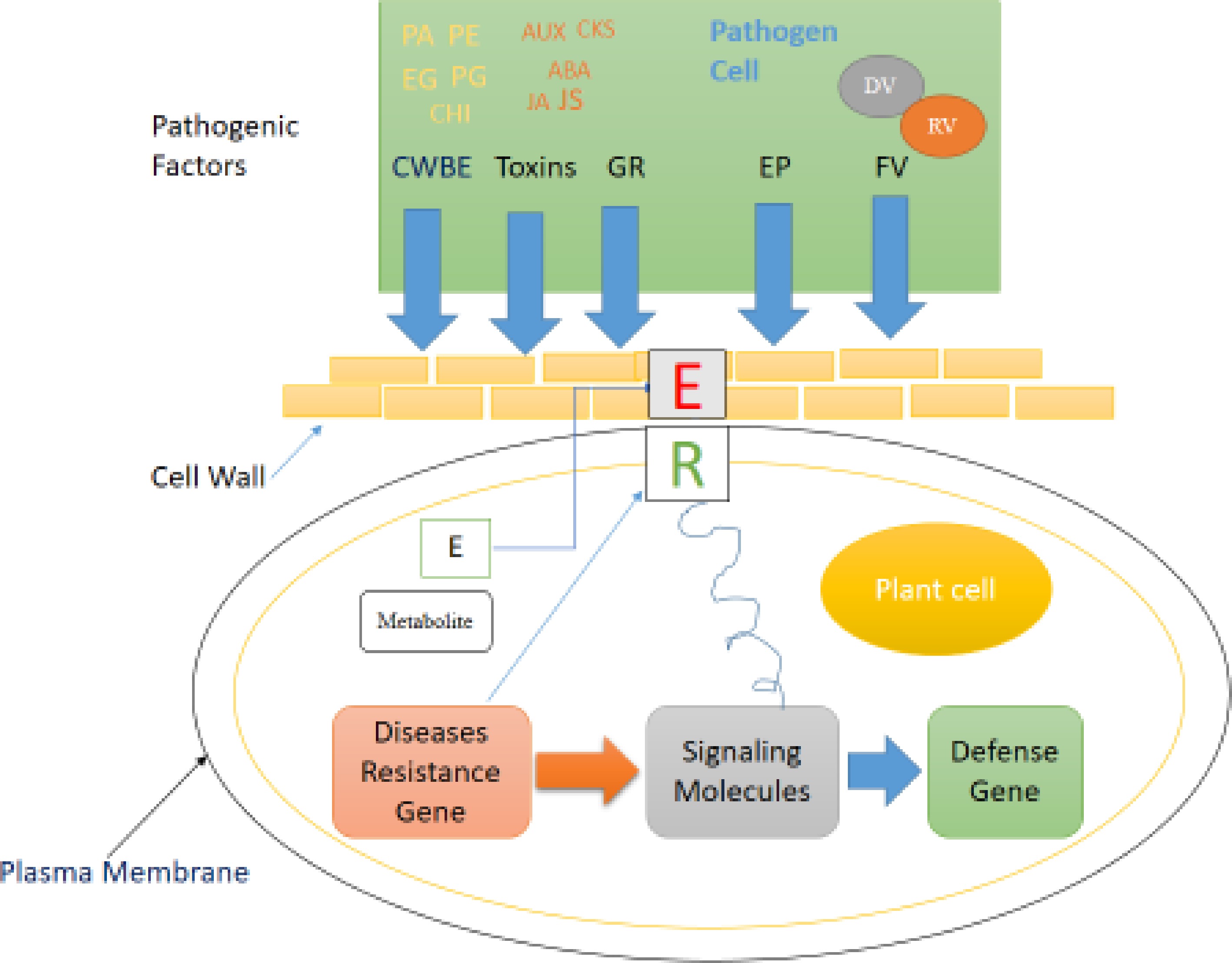 The pathogenic factors of phytopathogenic fungi CWBE, cell wall-degrading enzymes. PG, pectin polygalacturonase; PE, pectin methylesterase; EG, Endo-1,4-β-D-glucanase; PA, protease; CHI, chitinase; GR, growth regulator; AUX, auxin; CKs, cytokinins; ABA, abscisic acid; GA, gibberellic acid; JA, jasmonic acid; FV, fungal virus; DV, DNA virus; RV, RNA virusn[9,19].
