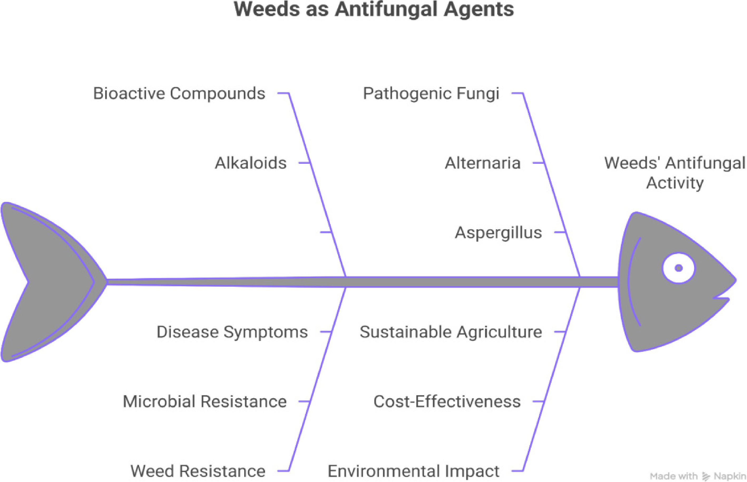 Figure 5 elucidates the concept of weeds as antifungal agents, outlining various factors contributing to potential applications and the associated challenges. Weeds possess antifungal activity due to the presence of bioactive compounds- alkaloids, flavonoids, and terpenoids, specifically mentioning alkaloids, which can combat pathogenic fungi such as Alternaria and Aspergillus. This property holds promise for applications in sustainable agriculture due to its cost-effectiveness. However, the utilization of weeds as antifungal agents also presents several challenges, including the potential for disease symptoms, the development of microbial and weed resistance, and environmental impact.