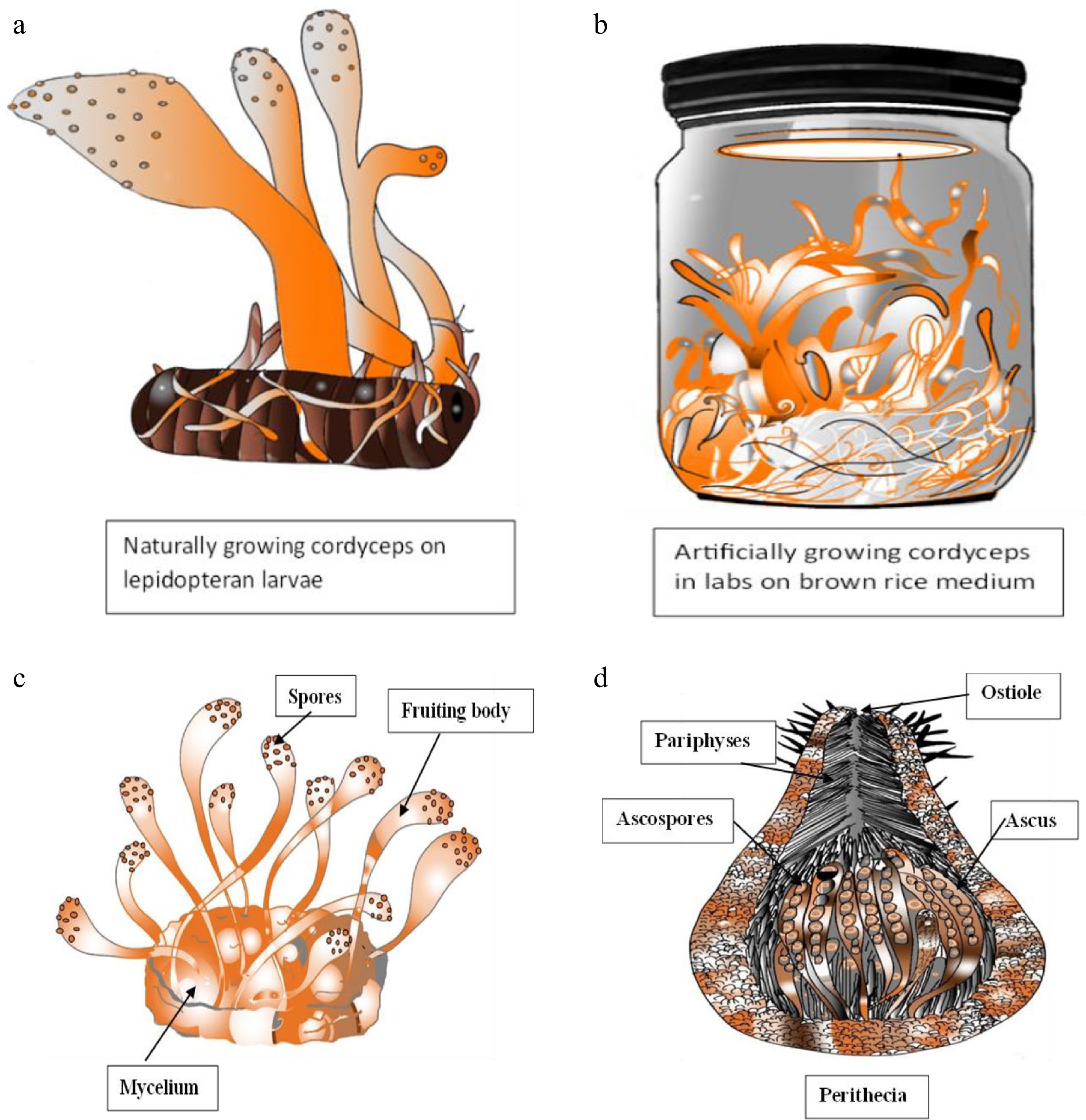 Cordyceps are classified within the Kingdom Fungi, Division Ascomycota, commonly referred to as 'Sacfungi', and falls under the Class Sordariomycetes, Order Hypocreales, Family Cordycipitaceae, Genus Cordyceps, and Species C. militaris[2]. The macroscopic characteristics of C. militaris include bright orange to reddish-orange fruiting bodies, which are either club-shaped or cylindrical, typically ranging from 2 to 6 cm in height (Fig. 1a–c). Microscopically, these structures contain perithecia, which are flask-shaped fruiting bodies located within the orange club-like stromata (Fig. 1d). Each perithecium has a small opening at the top, known as an ostiole, for spore release and is composed of asci and paraphyses, the latter being sterile filaments. The ascospores are fragmented, with each perithecium housing asci that contain eight ascospores. The asci are cylindrical or clavate, eight-spored, and feature a distinct apical cap. Upon maturation, spores are expelled through the ostiole. The hyphae are colorless and septate, leading to the formation of conidiophores. On these conidiophores, hyaline, flask-shaped phialides are produced, which subsequently generate barrel-shaped conidia[25].
