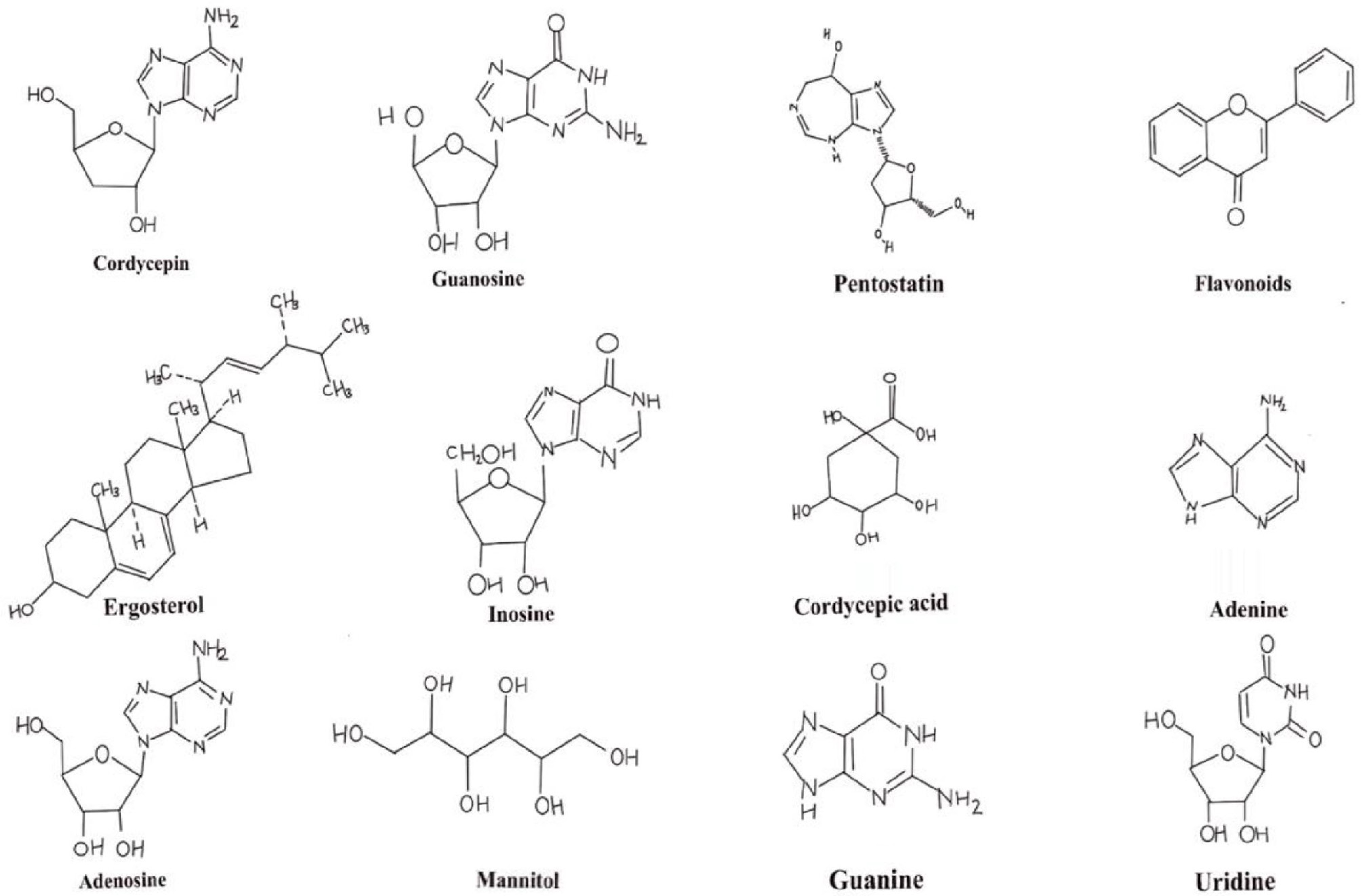Due to its high medical significance, Cordyceps has been widely used in the production of medicines. It consists of various bioactive metabolites like cordycepin, adenosine, inosine, mannitol, sterols, polysaccharides, pentostatin, and cordymein, which has been considered very useful in cancer treatment, improving cardiovascular health, and various other activities[26] (Fig. 2). Cordycepin exhibits potent anti-cancer, anti-inflammatory, and antiviral properties by inhibiting cancer cell proliferation, making it valuable in treatments for leukemia and other cancers, while also reducing inflammation[27,28]. Adenosine supports cardiovascular health by acting as a vasodilator, widening blood vessels to improve circulation and benefiting heart health[29]. Inosine enhances immune function and neural health by promoting antibody production and offering neuroprotective effects, which can be beneficial for neurological diseases and immune support[30]. Mannitol serves as both a diuretic and an antioxidant, helping to lower blood pressure by promoting urination and reducing oxidative stress through the elimination of free radicals. Sterols aid in cholesterol management and inflammation reduction, helping to lower LDL cholesterol levels and contributing to cardiovascular health[31]. Polysaccharides play a crucial role in boosting immune function and exhibiting anti-tumour effects by enhancing immune cell activity and inhibiting tumour growth, making them valuable for cancer treatments and general immune support[32]. Pentostatin is widely used in cancer treatment as it inhibits adenosine deaminase, a crucial enzyme for certain cancer cells' survival, making it particularly effective in treating specific types of leukemia[33]. Superoxide dismutase acts as an antioxidant enzyme that neutralizes free radicals, reducing oxidative stress and aging related damage. Cordymin is a protein that exhibits antifungal and immunomodulatory characteristics, aiding in antimicrobial defense[34]. Flavonoids are known for their antioxidant, anti-inflammatory, and cardiovascular-protective benefits. Extract of C. militaris reduces melanin synthesis and inhibits tyrosinase activity, hence preventing age spots, lightening skin tone, and promoting more even and smoother skin[35]. Nucleosides such as guanosine and uridine are involved in cellular metabolism and neuroprotection[5]. The various other compounds with their medicinal properties are depicted in Table 1.