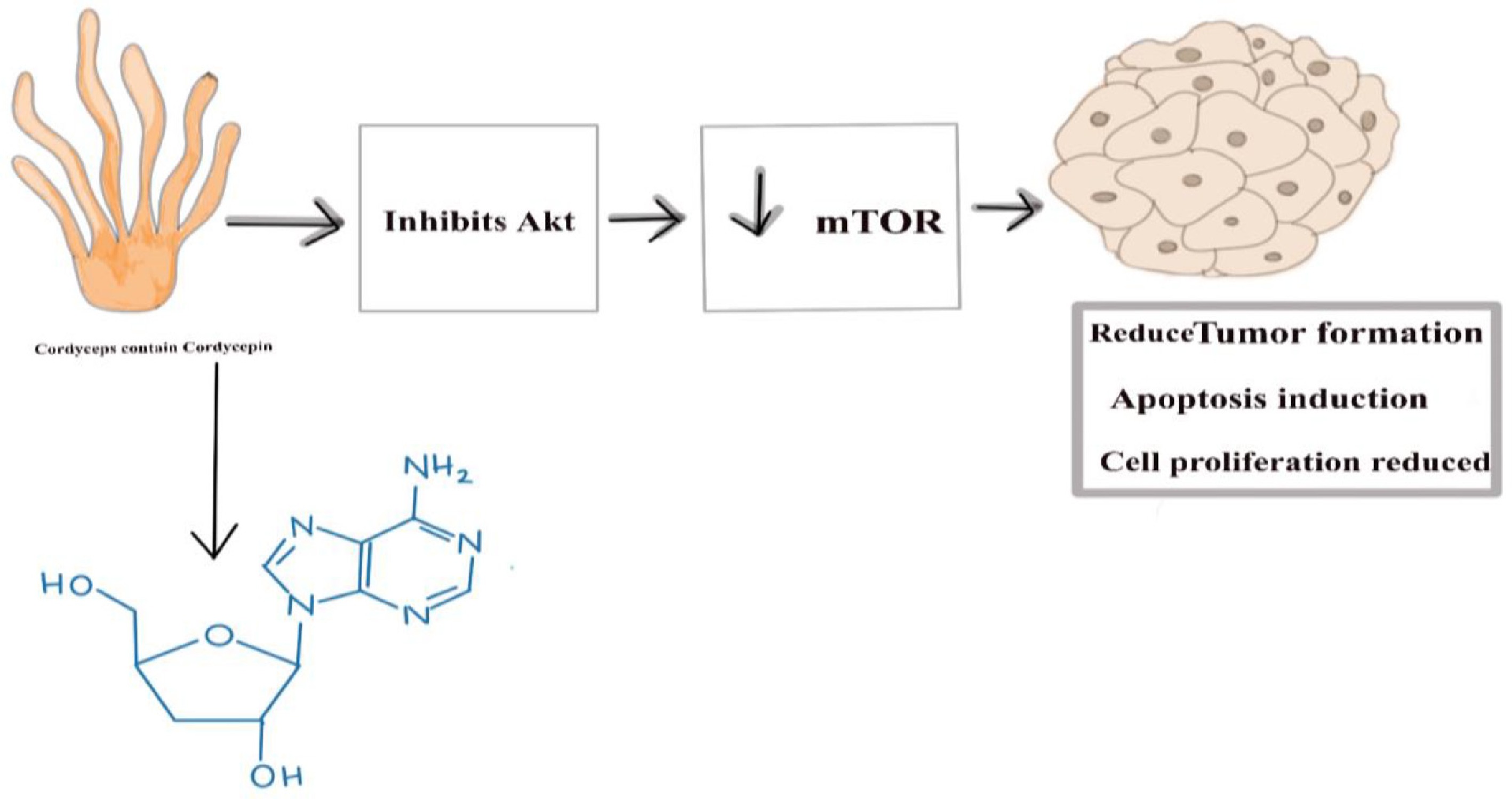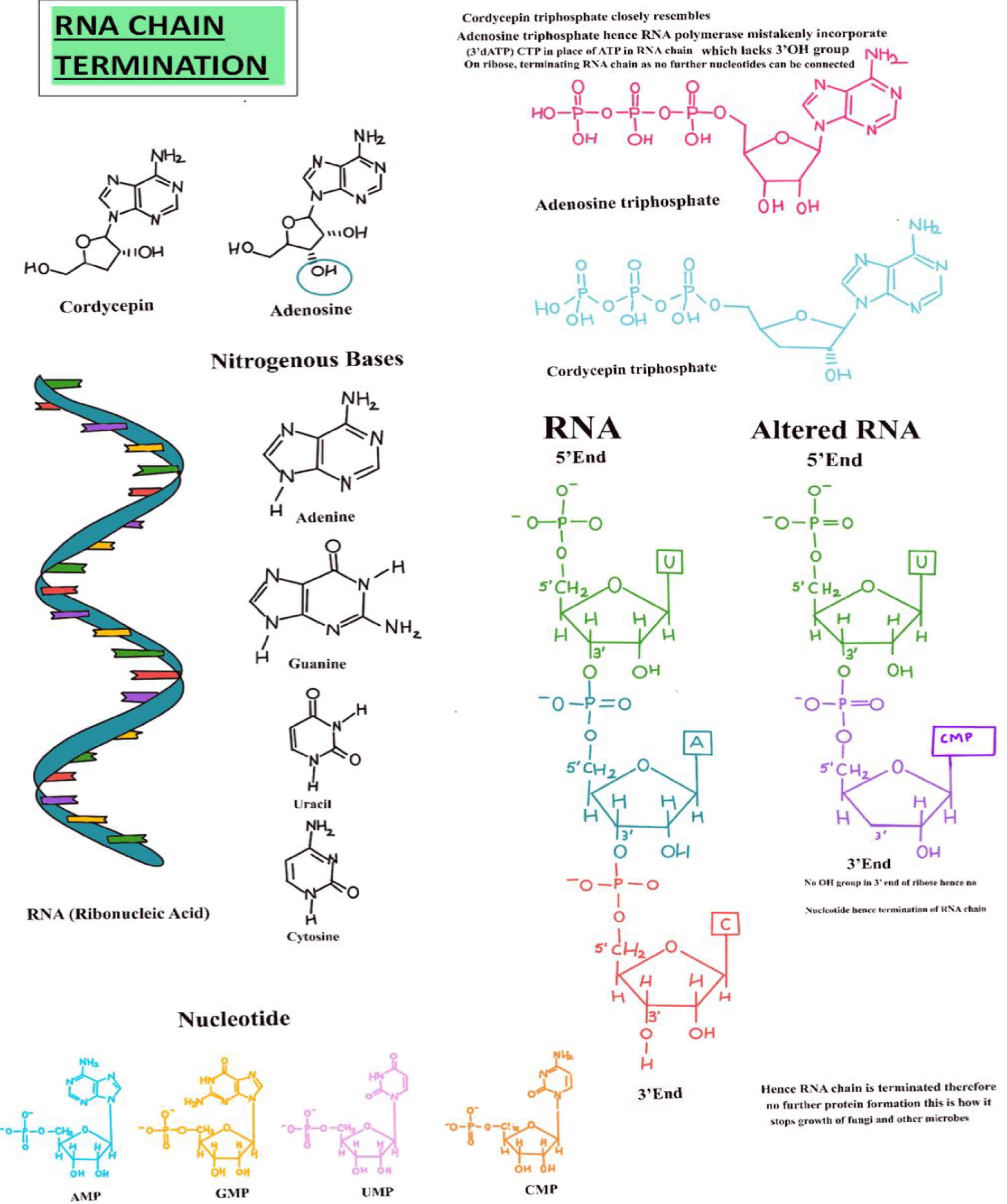 Cordycepin (3'-deoxyadenosine) is a nucleoside analog structurally like adenosine, distinguished by the absence of a hydroxyl (-OH) group at the 3' position of its ribose sugar. Once inside the cell, cordycepin undergoes phosphorylation by cellular kinases, transforming it into its active triphosphate form, 3'-deoxyadenosine triphosphate (3'-dATP). This active form is structurally like adenosine triphosphate (ATP), the standard substrate for RNA polymerase during transcription. During RNA synthesis, RNA polymerase incorporates nucleotide triphosphates into the growing RNA strand. When 3'-dATP is present, RNA polymerase may mistakenly incorporate it into the RNA chain in place of ATP due to their structural similarity. This incorporation involves the cleavage of the two terminal phosphate groups (pyrophosphate) from 3'-dATP, resulting in the addition of cordycepin monophosphate (3'-dAMP) to the 3' end of the RNA strand. However, unlike the regular adenosine monophosphate (AMP), 3'-dAMP lacks the critical 3'-OH group necessary for forming the subsequent phosphodiester bond with the next nucleotide. The absence of this hydroxyl group prevents the addition of further nucleotides, effectively terminating RNA chain elongation prematurely (Figs. 3 and 4). This mechanism disrupts normal RNA synthesis, leading to the inhibition of mRNA production and, consequently, protein synthesis within the cell[51]. This inhibition of the RNA chain also prevents the growth of microbes, as no protein formation takes place. Along with the termination of the RNA chain, cordycepin inhibits Protein Kinase B (Akt) phosphorylation, thereby inactivating Akt. Since Akt activates mammalian targeting of rapamycin (mTOR), its inhibition leads to mTOR downregulation. mTOR controls cell growth, protein synthesis, and survival. The final result is reduced cell proliferation, increased apoptosis, and suppressed tumor growth[52].