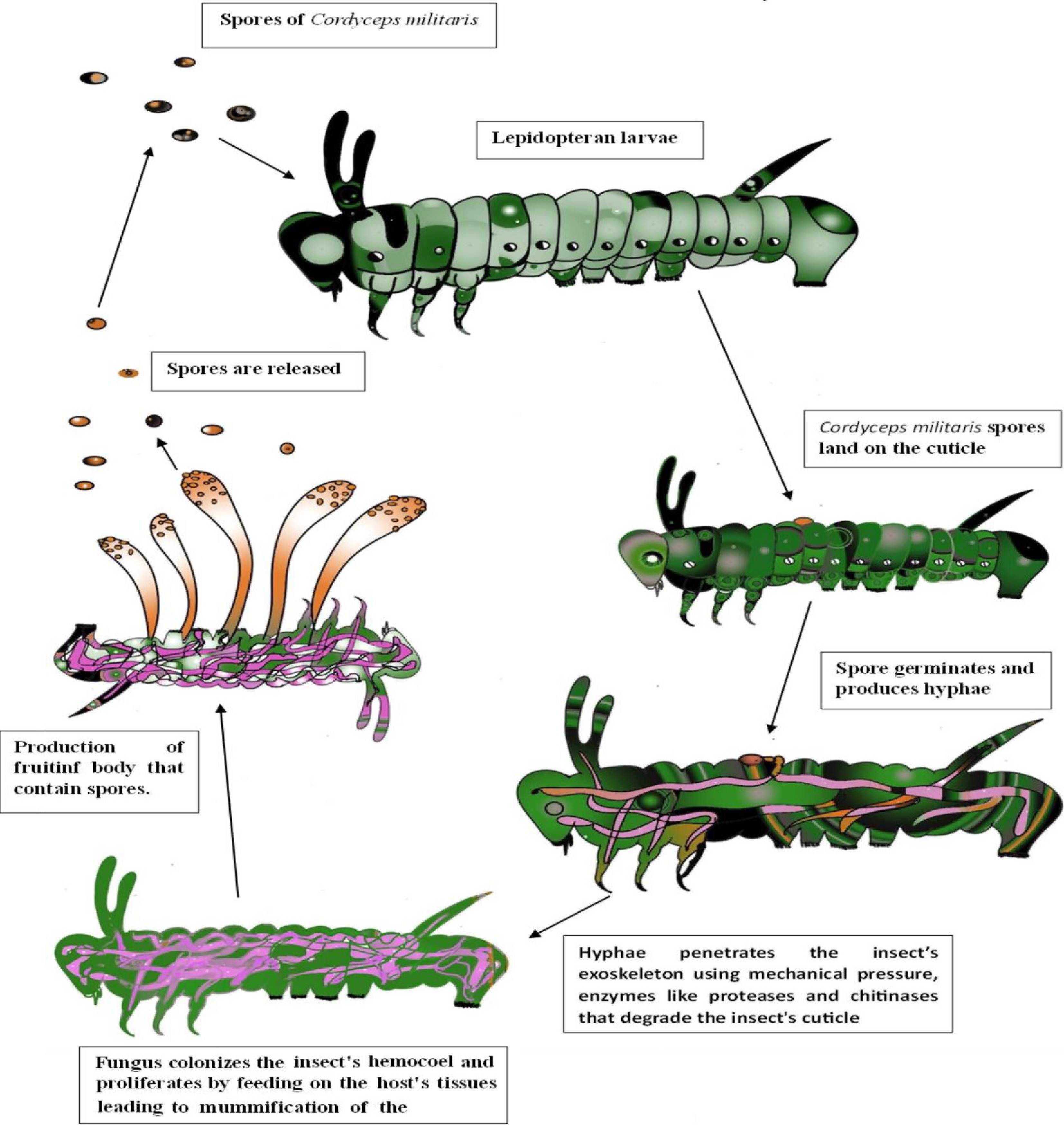 The primary natural hosts of C. militaris are lepidopteran larvae (caterpillars) and pupae, with less common hosts including coleopteran, hymenopteran, and dipteran insects. Lepidopteran hosts are classified into 12 distinct families. Other hosts from different orders include Ips sexdentatus, Lachnosterna quercina, and Tenebrio molitor (Coleoptera), Cimbex similis (Hymenoptera), and Tipula paludosa (Diptera). Additionally, over 25 species of higher heteroceriid lepidopterans and unidentified hymenopteran species have recently been identified as hosts for C. militaris. Research on the artificial cultivation and stroma production of C. militaris has been conducted using various insect pupae and larvae, with the silkworm Bombyx mori being the most frequently utilized. Other insects employed for artificial stroma production include Antherea pernyi, Mamestra brassicae, Tenebrio molitor, Ostrinia nubilalis, Heliothis virescens, H. zea, Spodoptera frugiperda, Andraca bipunctata, Philosamia cynthia, Spodoptera litura, and Clanis bilineata. The Daeseungjam variety has been identified as the most effective for stroma formation of C. militaris[61]. Cordyceps militaris primarily targets the larvae of Lepidoptera, commonly known as caterpillars. The infection process initiates when the spores of C. militaris, either conidia or ascospores, settle on the cuticle of a compatible insect host. These spores possess adhesive properties, allowing them to stick to the insect's surface with ease. Under favorable environmental conditions, such as adequate moisture and temperature, the spores germinate and form an appressorium, which is the organ of attachment which then initiates the infection peg. The infection peg penetrates the insect's exoskeleton by exerting mechanical pressure and utilizing enzymes like chitinases and proteases that break down the cuticle. Once inside, it differentiates into hyphae, which are thread-like structures of the fungus and helps in the absorption of the nutrients from the host. The fungus invades the insect's hemocoel, or body cavity, and thrives by consuming the host's tissues. It also employs various secondary metabolites to evade or suppress the insect's immune system, leading to the mummification of the insect (Fig. 5). Following the mummification process, C. militaris develops a fruiting body, characterized by its orange club-like shape, which protrudes from the cadaver of the insect, usually from the head or thorax. These fruiting bodies generate and release new spores into the environment, facilitating the infection of additional hosts[7].